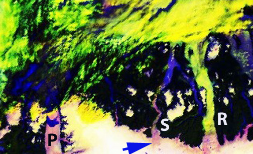 Melting has been significant in northern Greenland for three straight summers. In 2010 the first image the melt area is below 1000 meters at the head of the Steensby Glacier outlet denoted by red arrows, this is a typical pattern of the last few years (P=Petermann, R=Ryder, S=Steensby). In 2012 the area of extensive melt has expanded from a zone around the head of the valley of Steensby and Ryder Glacier near 1000 m in July (blue arrows) to a wide zone extending all the way from Steensby to Ryder Glacier in August.