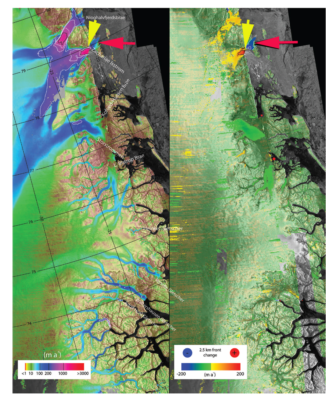 In an article Dan Bailey and I published at Skeptical Science, we observed that in northern Greenland high velocities extend far inland only on Zachariae and Petermann Glacier tapping into the midst of the ice sheet in northern Greenland. Further, it is the Zachariae Isstrøm (ZIS) that is likely the only of this group that would be comparable to a bank that is too big to fail as its increased velocity band extends well into the ice sheet. ZIS is one of the three main outlets of the northeast Greenland Ice Stream, Storstrommen and Nioghalvfjerdsfjorden (79N) are the other two.