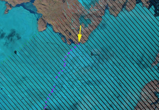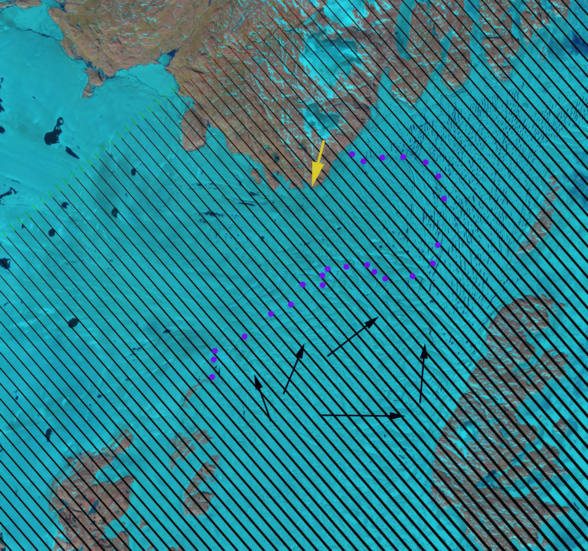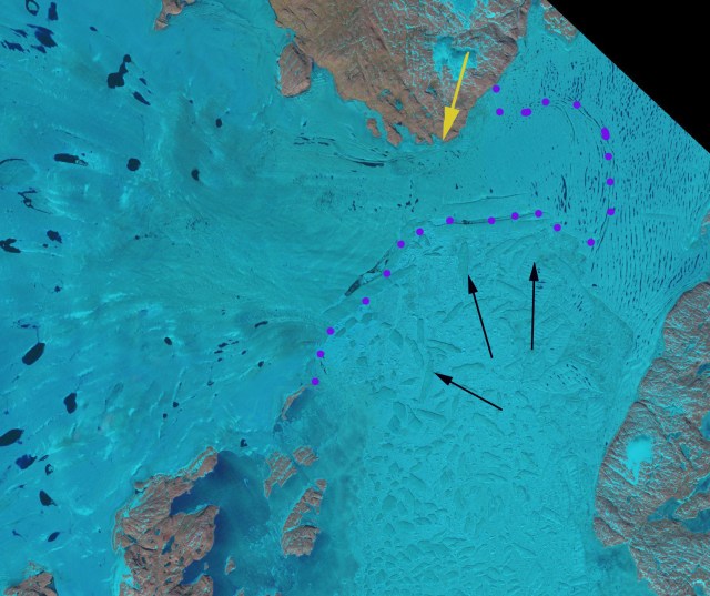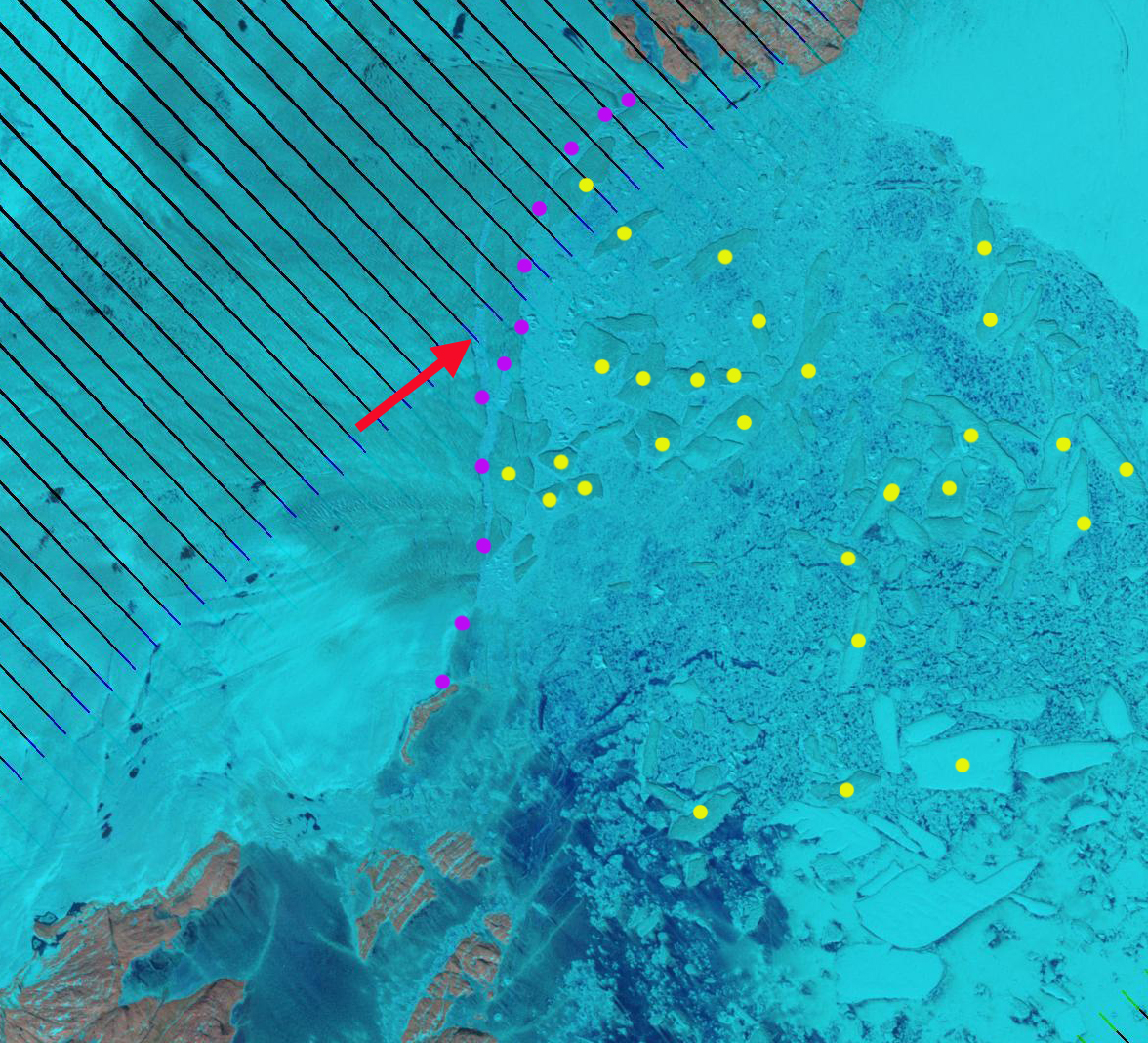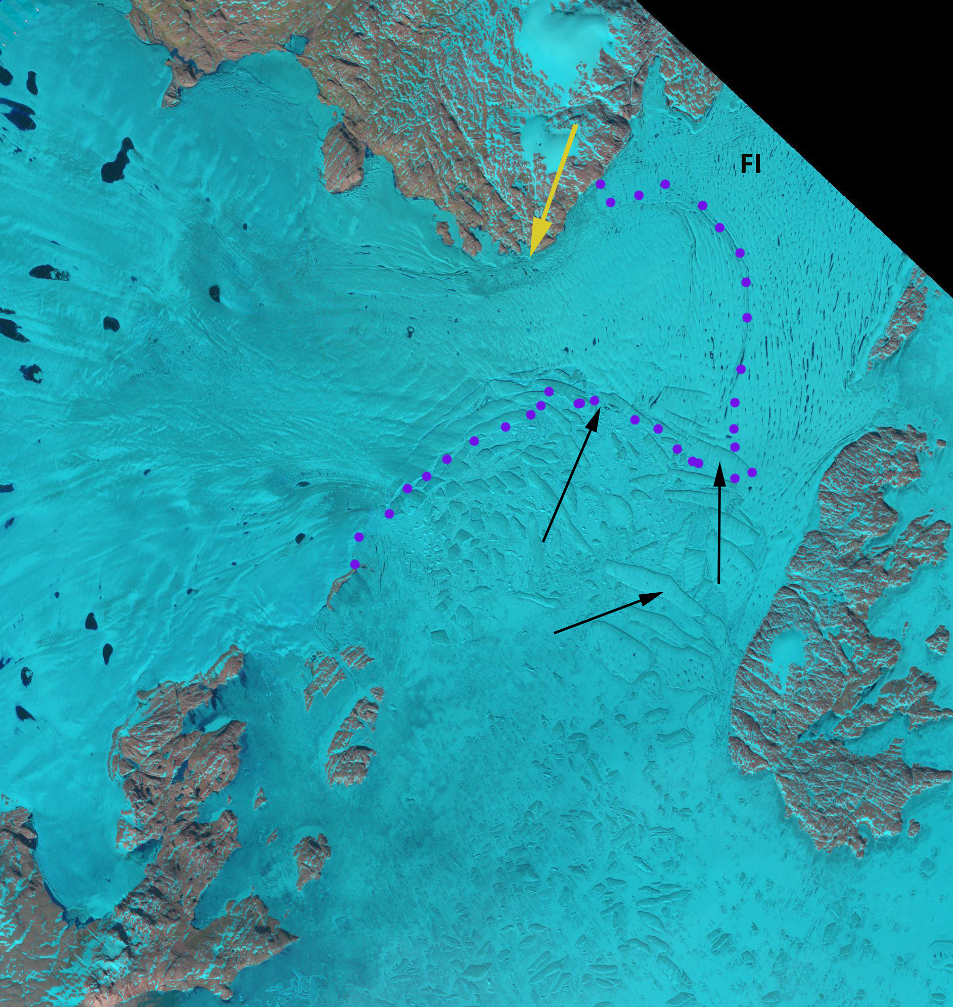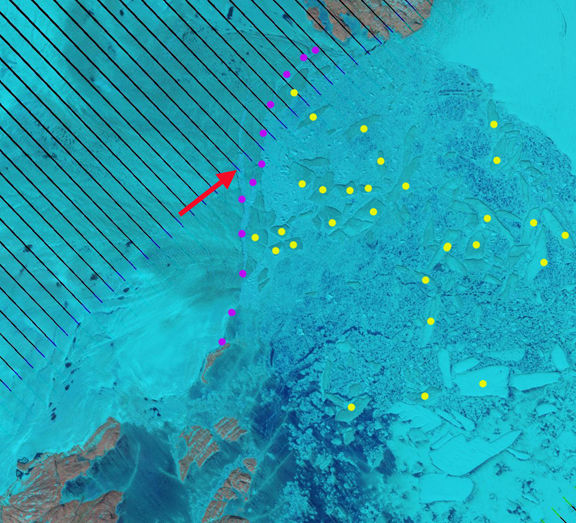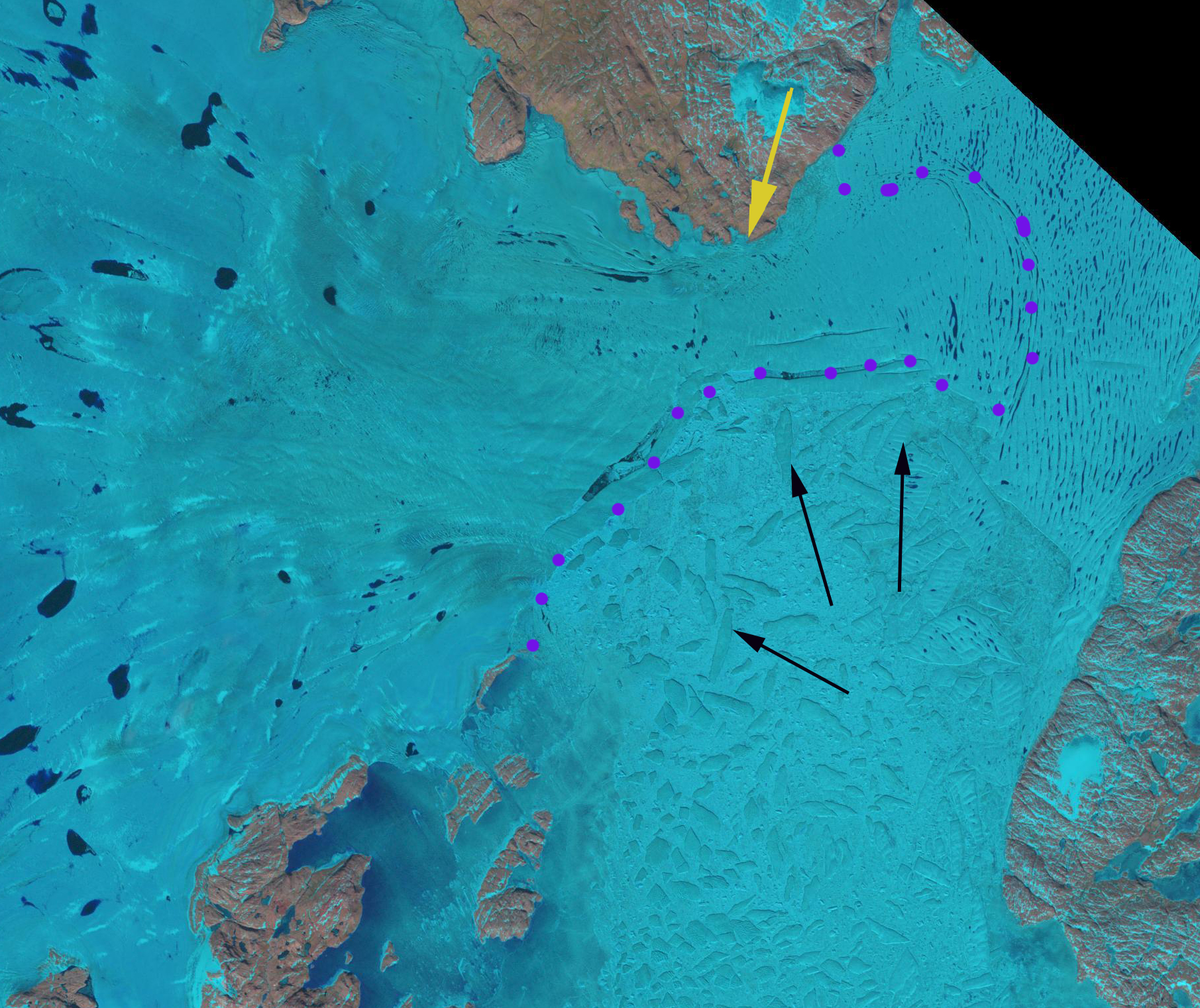 2013 from June 17 Landsat image, yellow dots are icebergs, purple dots terminus, red arrow a rift that will lead to another significant calving event this summer.
