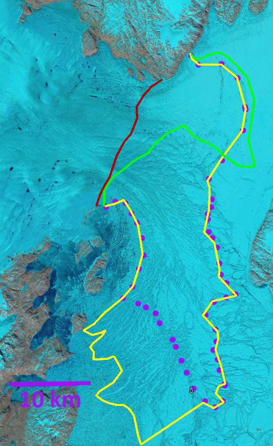 This post examines recent changes in ZIS updating the work of Box and Decker (2011). They noted an average decadal rate of loss of 14 square kilometers/year and the evolving terminus position in the first image below from Jason Box at Meltfactor.org. Box and Decker (2011) also noted a potential advance in 2006-2007, that we will further explore here.