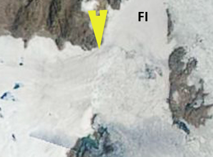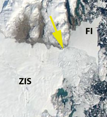 A view of the basal topography from Joughin et al (2001) indicates that the acceleration occurs in the same area as the bed depth drops significantly below sea level 200 km from the ice front. The base of the glacier is 300-700 meters below sea level all the way to the ice front. The thickness at the grounding line is noted as 550-600 meters by Rignot et al (2001). The result is an ice flux at the grounding line of ZIS of some 11 cubic kilometers per year, this is much less than the 40+ cubic kilometers from Jakobshavn Isbrae and similar to the 12 cubic kilometers from Petermann Glacier. The red arrows in both images indicates the area of fast ice, discussed below and the yellow arrow the location of the new 2012 ice front.