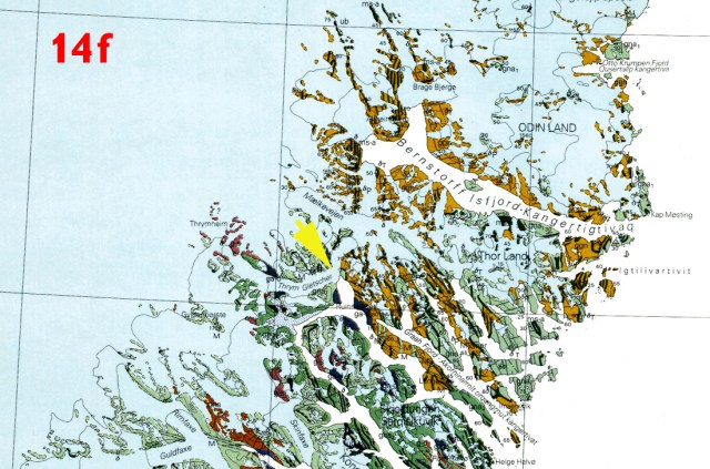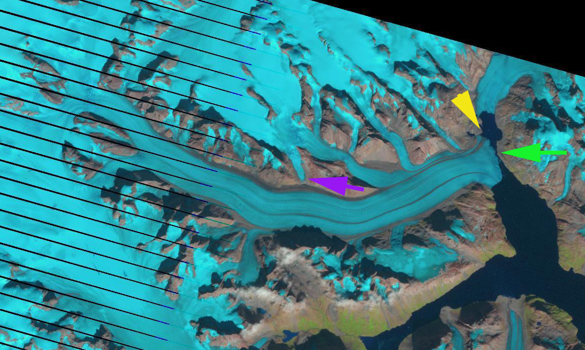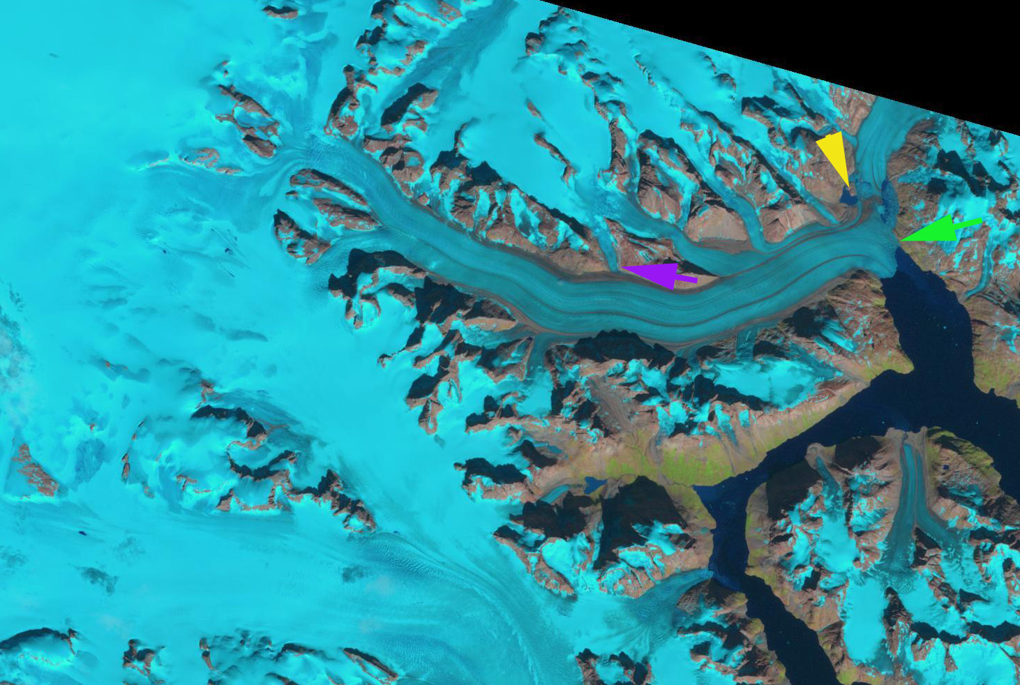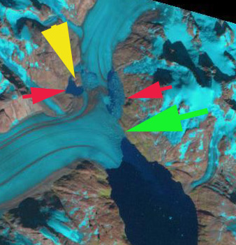 Thrym Glacier’s terminus in 2000 was connected with a second glacier flowing from the north, a branch of the Maelkevejen. The first change since 2000 is the opening of a channel between the terminus of the glacier and the fjord wall (green arrow) on the east side of the valley. This removes a pinning point for the glacier that should enable an increase of calving in the greater water depths. At the junction of the two glacier a lake has developed that now is part of the fjord. This water body has expanded to 2.5 km in length and 1.5 in width (yellow arrow). Upglacier of the terminus the glacier is fed by many tributaries, one of these has separated from the glacier in the last decade and is no longer feeding ice into the system, purple arrow.