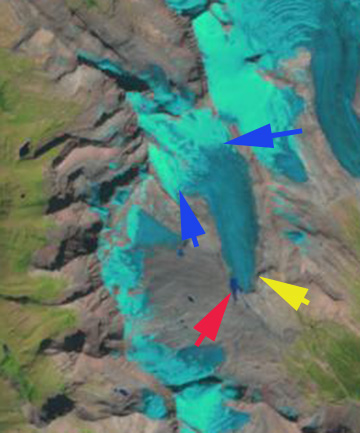 In this post we examine the continued retreat and development of a new lake at the terminus of the glacier using Landsat imagery from 1988, 2001 and 2012. In 1988 no lake exist at the terminus, red arrrow. The glacier extends well past the prominent ridge on the east side of the glacier shortly above the terminus, yellow arrow. The blue arrow indicates that the snowline is very high 2650 m, which is 200 m higher than that necessary for the glacier to be in equilibrium. By 2001 a small lake had developed along the west side of the glacier and the glacier had retreated 300 meters from 1988. By 2012 a substantial lake has developed that is 600 m long and 500 m wide. The glacier has retreated beyond the prominent ridge east of the glacier, yellow arrow. Total retreat from 1988 is 800 meters and 450-500 meters since 2001. The retreat rate since 1988 has increased to 25-30 m/year since 1988. The snowline despite this being an Aug. 12th image is already at 2600 meters. The issue for this glacier is that the consistent snowline is too high to support the main valley tongue of the Des Poilus Glacier, which will dissappear (Pelto, 2010). The only section of the glacier that maintains snowcover is on the east flank of slopes of Mt. Des Poilus.