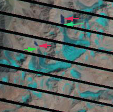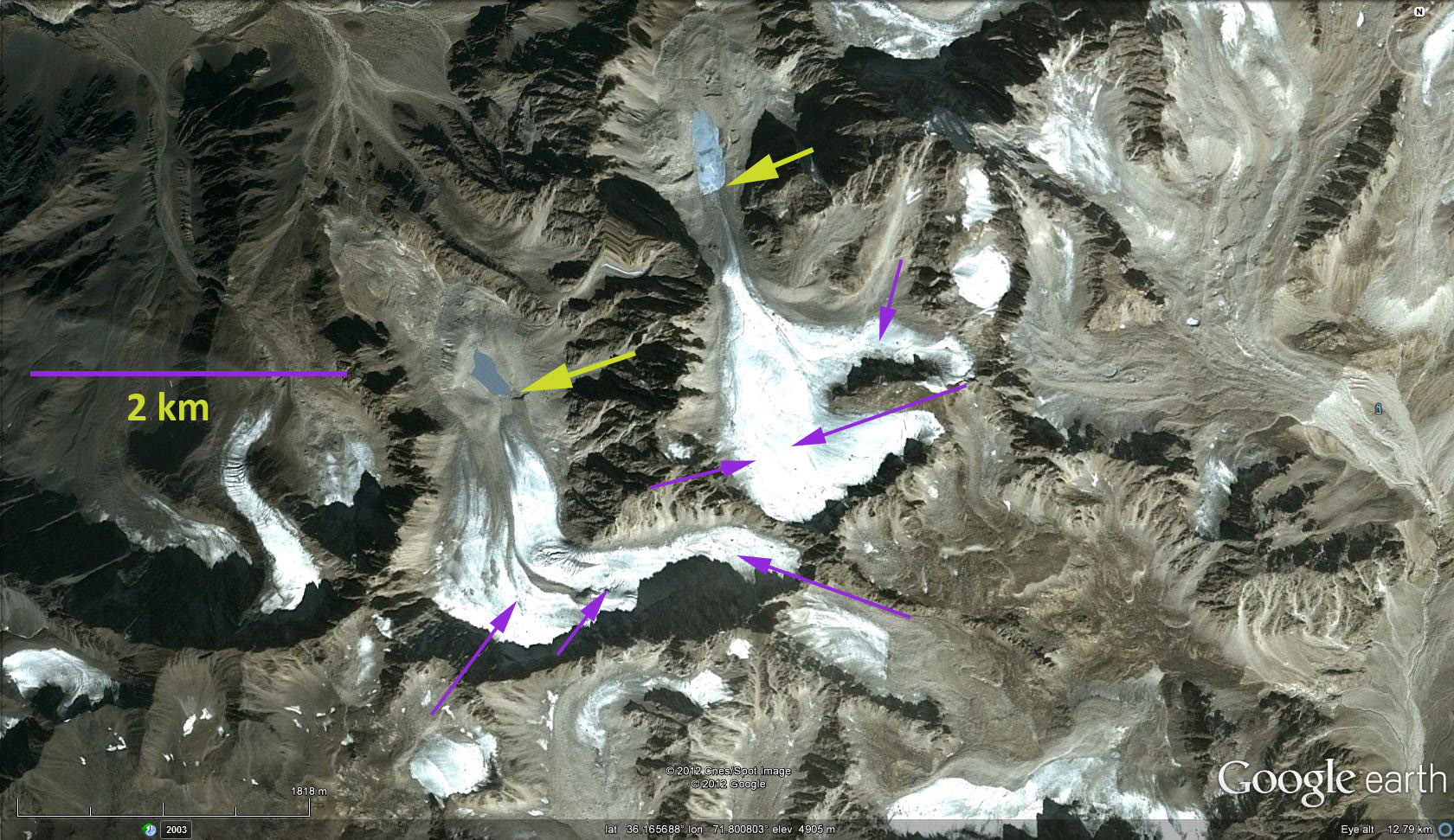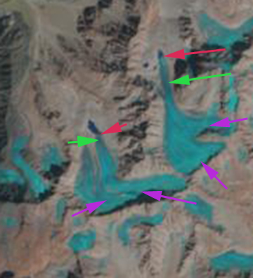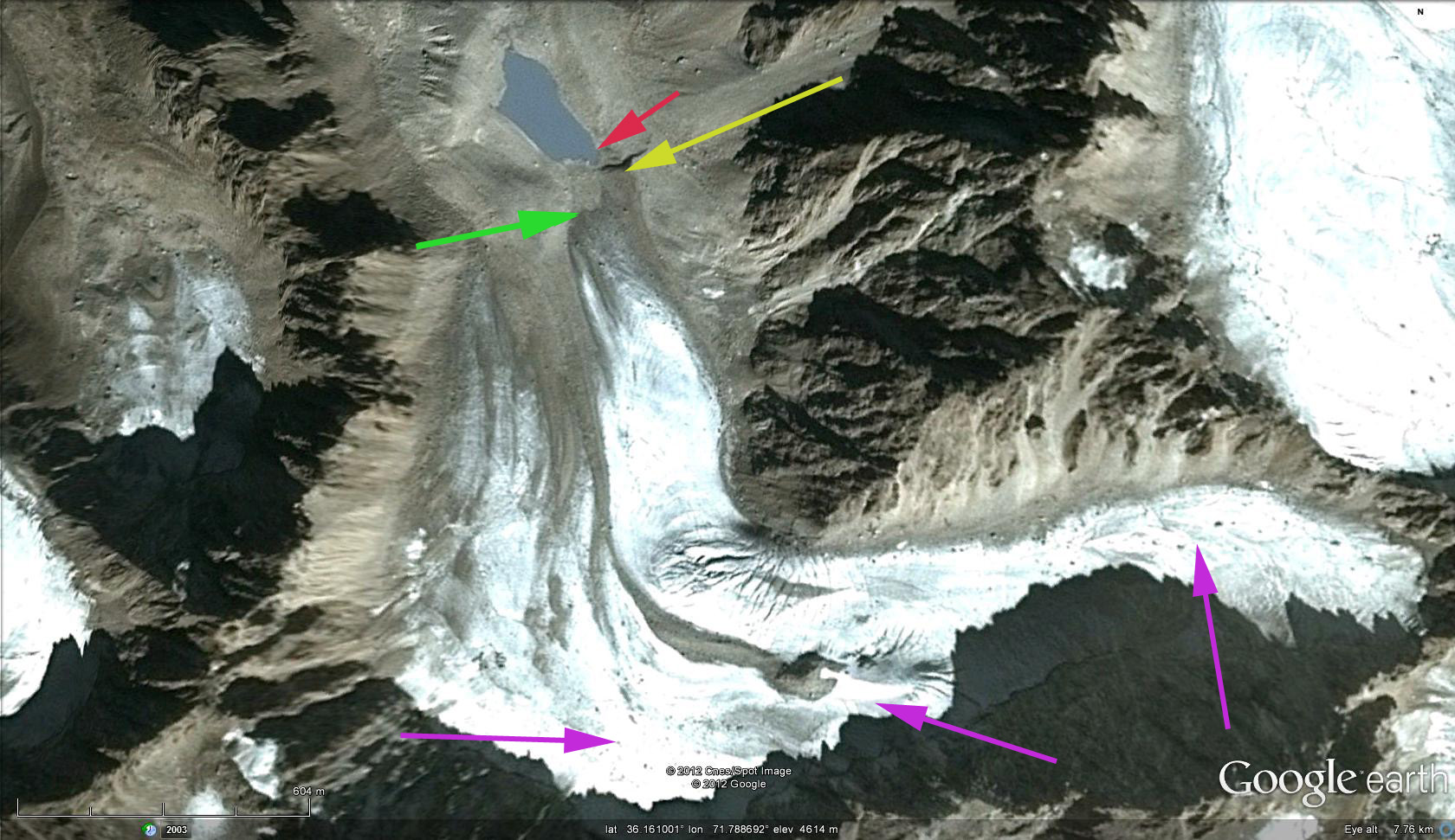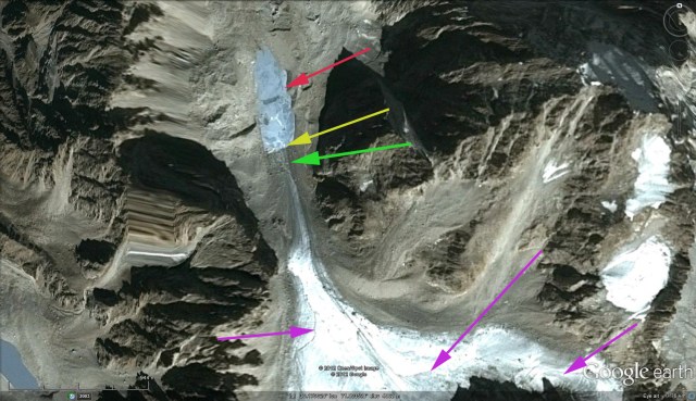 A 2000 Landsat image (top image) indicates both glaciers ending in small lakes. The arrows in all images are purple for the lack of snowcover even in the glacier accumulation zone, red for the 2000 terminus, yellow for the Google Earth terminus and green for the 2011 terminus. By 2008 the Google Earth imagery indicates that the eastern of the two has retreated 400 meters leading to a more than doubling of the lake size. For the western glacier, the glacier still maintains has just retreated from the lake margin. The lake is slightly larger than in 2000. There is no snowpack on either glacier in the Google Earth imagery or in the 2000 image even at 5000 meters. This indicates glaciers without persistent accumulation zones, which means they cannot survive (Pelto, 2010).