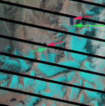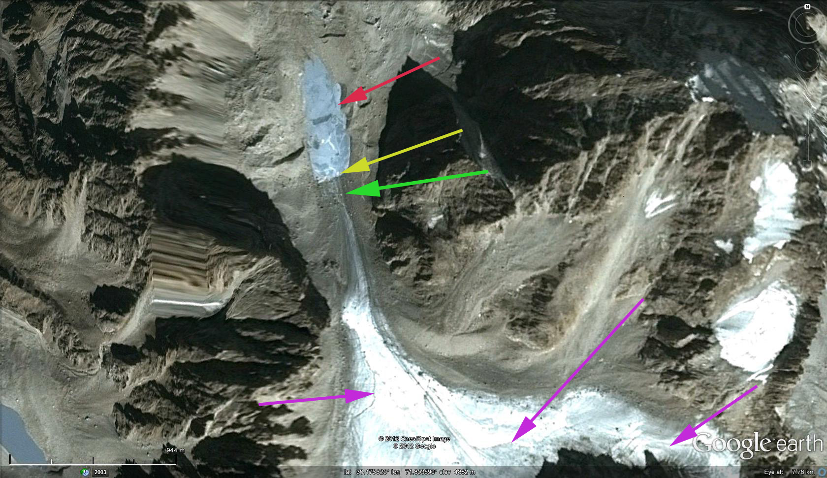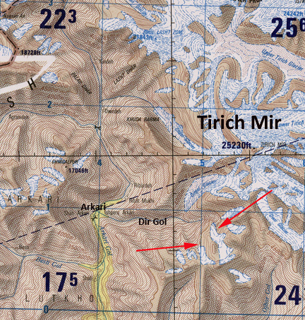 Tirich Mir is the highest mountain in the Hindu Kush and is in the northwestern corner of Pakistan. Here we examine Google Earth and Landsat imagery from two glaciers off the southwest ridge of Tirich Mir. The two glaciers are unnamed and are in the Dir Gol Valley, that starts in Akari, Pakistan and drains the southwest side of Tirich Mir, red arrows.