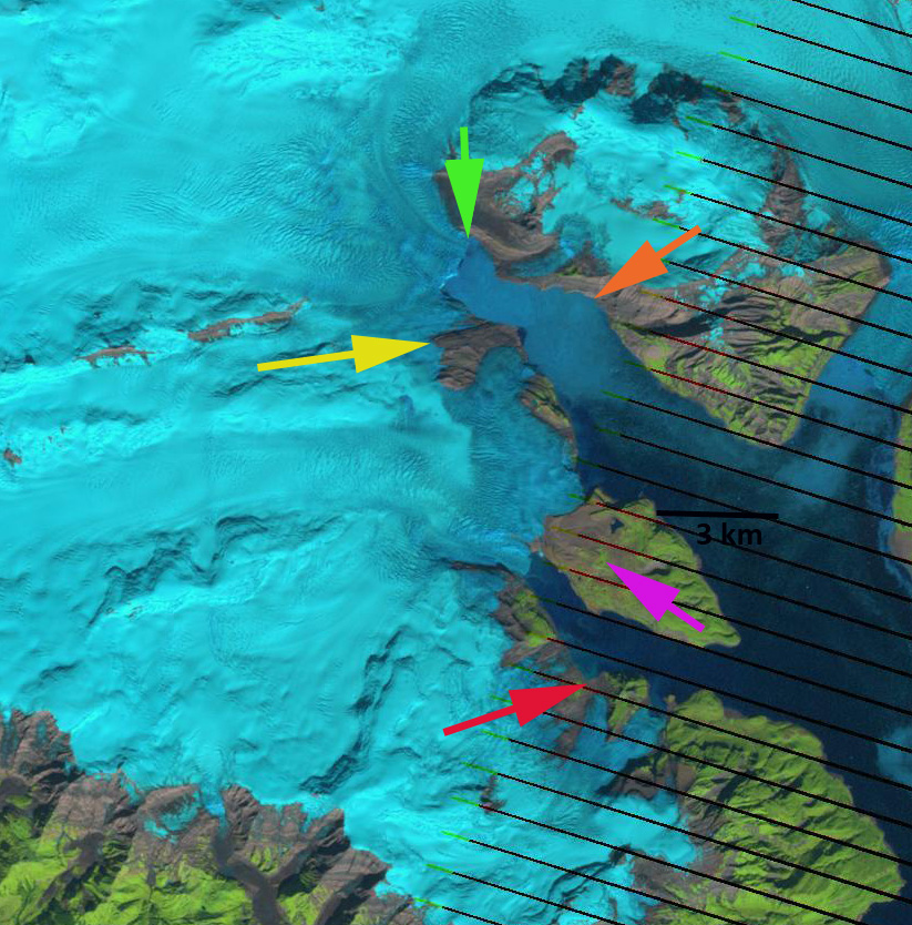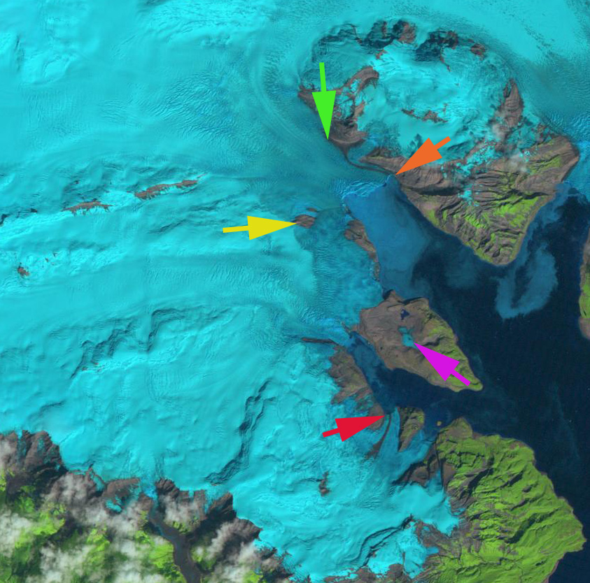 Barclay et al (2009) have illustrated the dynamic nature of this glacier that has had three large (40 Km+) advances and retreats in the last 4000 years. The Landsat image sequence is from 1984, 1995, 2000 and 2010. In each image the pink arrow indicates an area on the Kashteen Peninsula that was still covered by the glacier until 1980. In 1984 on Kashteen there are two ice masses with an area of 1.3 square kilometers, by 1995 one small ice mass of 0.3 square kilometers, by 2000 the stranded ice masses are gone. By 2010 the area is showing considerable vegetation development. This indicates a relatively short ecesis rate, rate of vegetation returning after deglaciation. The orange arrow indicates the 1984 terminus of Guyot Glacier. The green arrow is the 2010 terminus position of Guyot Glacier, the main terminus retreated 3.8 km during the 26 year period. The yellow arrow indicates the expansion of a bare bedrock region on the south side of the main Guyot Glacier terminus that now extends 2 kilometers from the margin. The red arrow is a separate terminus of an unnamed glacier that ended in Tsaa Fjord up to 2000, and is no longer tidewater, having retreated 400 meters from tidewater and 600 meters since 1984.