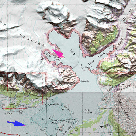 As retreat began the glacier had a calving front that was over 10 km long. The glacier was also calving into deep water. This led to a rapid retreat up to 1938 (USGS). In the sequence of images below from the USGS, this is evident. By 1969 the glacier had separated into three sections, middle image in sequence and by 1986 the Guyot Glacier had retreated a considerable distance up the newly exposed fjord. The pink arrow points to the Kashteen Peninsula that will emerge, and the orange arrow to the 1984 terminus position of Guyot Glacier.