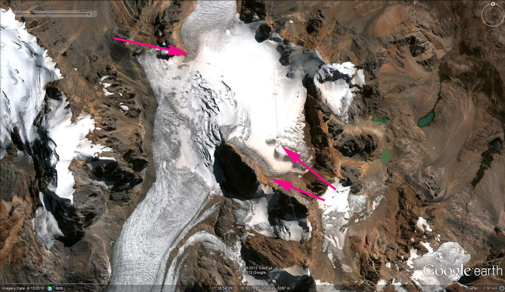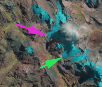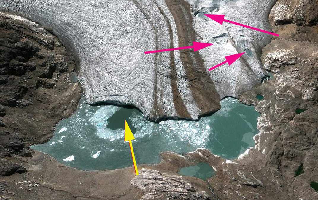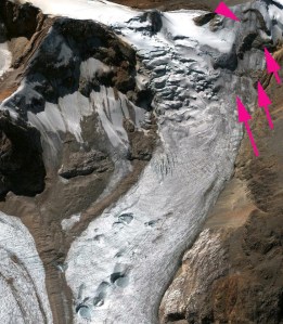 A closeup view of the glacier indicates that even in the accumulation zone bedrock is being exposed amidst the icefall and the accumulation zone margin in retreating, pink arrows in both images.