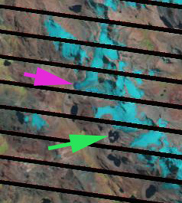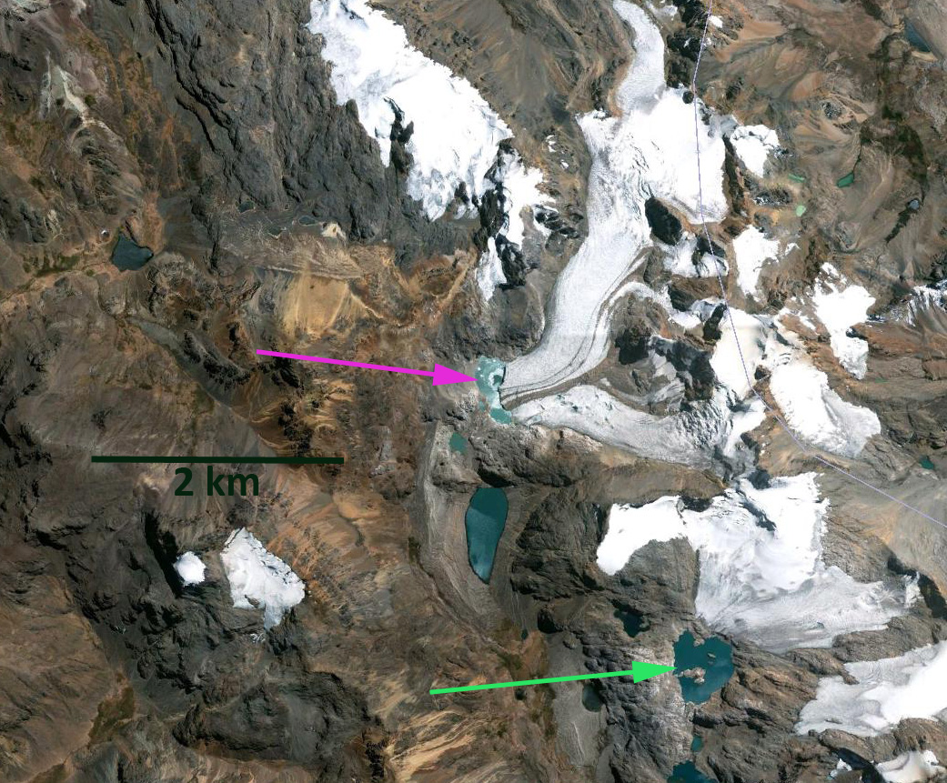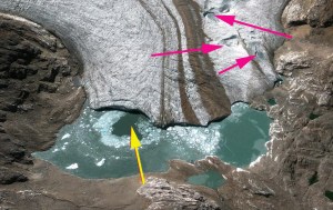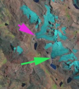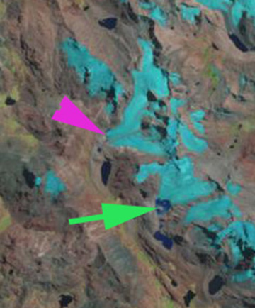 The terminus currently is calving into the lake some, an upwelling area where the subglacial glacier runoff stream enters the lake is evident, yellow arrow. The terminus area also has ablation depressions forming an indication of stagnation, principally on the southern arm of the glacier, pink arrows. The purple arrow on the bottom image indicates the terminus in 1997. The combination of limited accumulation area and ablation depressions indicative of stagnation indicate a glacier that is not only retreating, but will not survive (Pelto, 2010). The ongoing field work at Quelcaya Ice Cap, led by Doug Hardy at UMASS, provides a detailed view of what is happening to glaciers in the region. Bryan Mark at Ohio State University has also been observing detailed changes around Mount Pucaranra, Peru.
