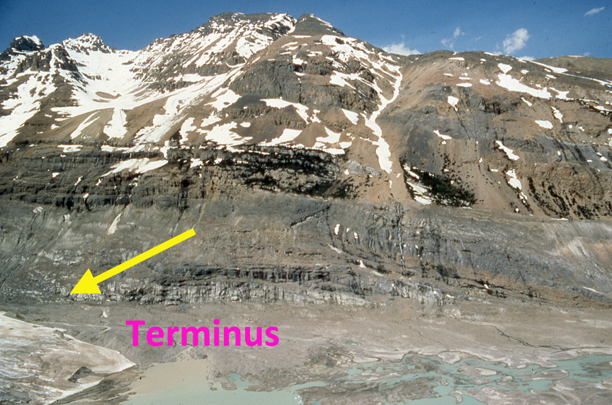 The terminus when I first visited the glacier in 1983 was just at the western margin of the lake that had developed at the glaciers terminus, first image below. The recession of the glacier since the late 19th century is similar to that of other glaciers in the area and was greater than 2 km. middle image from USGS. Bolch et al (2010) identified a 25% loss in glacier area in Alberta from 1985 to 2005, indicating the retreat goes on regionally. The third image is of the trimline above the glacier marking the height of the glacier a century before.