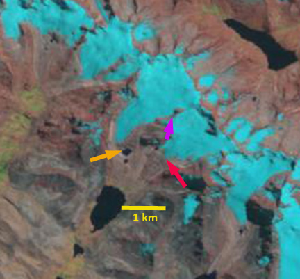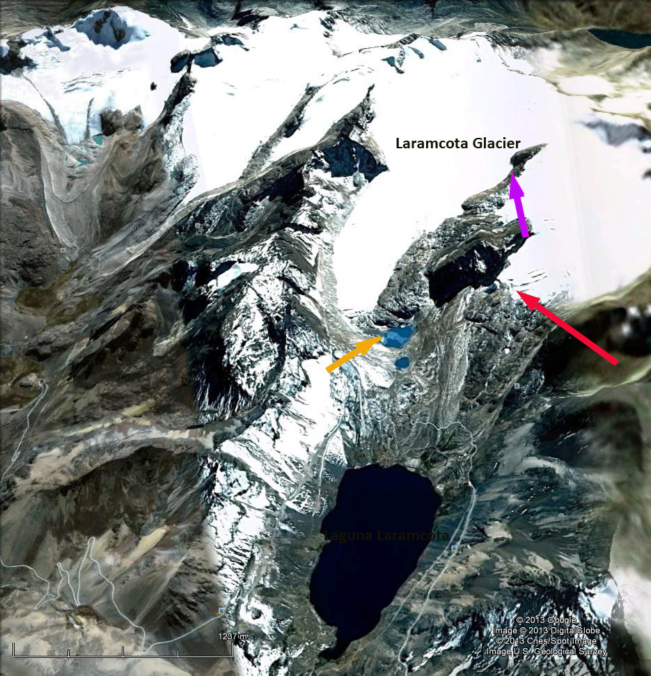 In 1988 the glacier ends at a small lake one kilometer upstream of Laguna Laramcota, orange arrow. The glacier just to the east ends just 600 meters from the Laramcota, red arrow. The ridge separating the two glaciers at the purple arrow is quite narrow. By 2011 the glacier has retreated 300 meters from the lake, orange arrow. The glacier just to the east has retreated 200-300 m as well. The ridge separating the glaciers has expanded considerably in width, purple arrow. The overall loss in glacier from 1988-2011 is 10-15%. The retreat of this glacier fits the pattern of other Bolivian Glaciers, such as the Zongo Glacier or Nevada Cololo and tropical Andean glaciers in general (Rabatel et al, 2013).