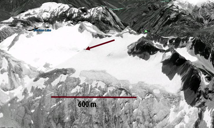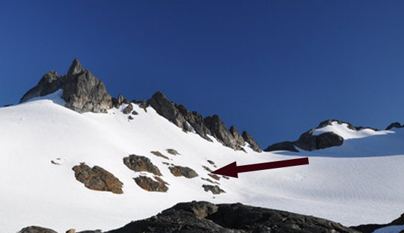 Here we examine photographs of the glacier to identify changes from 1979 to 2010. The burgundy arrow indicates the rock outcrop between the upper northern part of the glacier and the lower southern part of the glacier. In 1979 there is one small outcrop of rock between the upper and lower part of the glacier, the glacier has numerous extensively crevassed regions. From 1985-1990’s this one outcrop remained visible but did not notably change, as seen in the 1998 and 1999 image below. By 2006 and 2007 a network of outcrops had emerged, as the upper glacier became increasingly separated from the lower and southern section of the glacier. By 2009 the outcrops had merged into two large outcrops 270 m across, the main terminus had retreated only 50 m from 1979 to 2011, but the thinning of the glacier indicates much more significant changes to come. The thinning of the upper glacier indicates a glacier that cannot survive current climate, though it is not disappearing rapidly (Pelto, 2010). In 2010 the early August image indicates the extent of the rock outcrops that have still not melted out from the previous winter snows. We will be interested to see the glacier again this summer when we head to the field. This glaciers response is similar to Quien Sabe Glacier and Daniels Glacier.