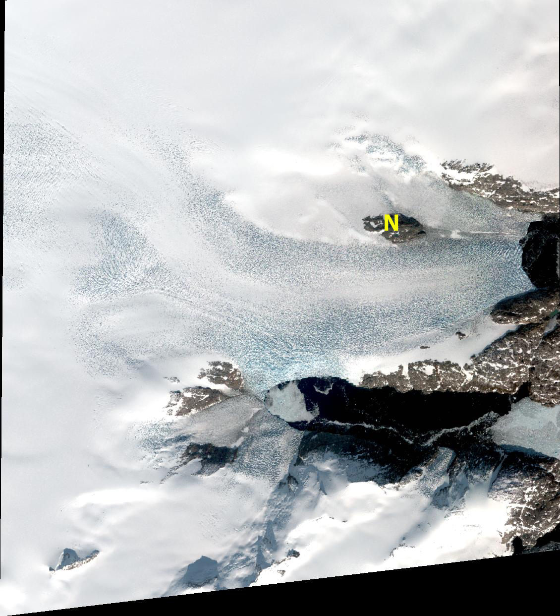 Puisortoq North Glacier southeast Greenland has experienced an increased rate of retreat since 2000. The retreat is expanding a fjord that begins just north of the Puisortoq Peninsula and west of the Otte Rud Island.