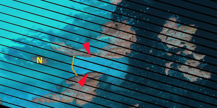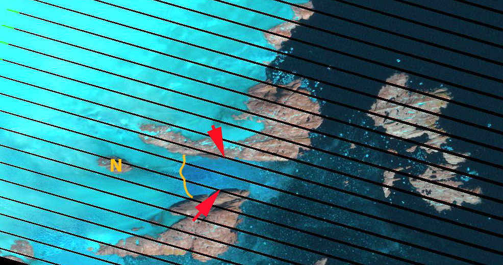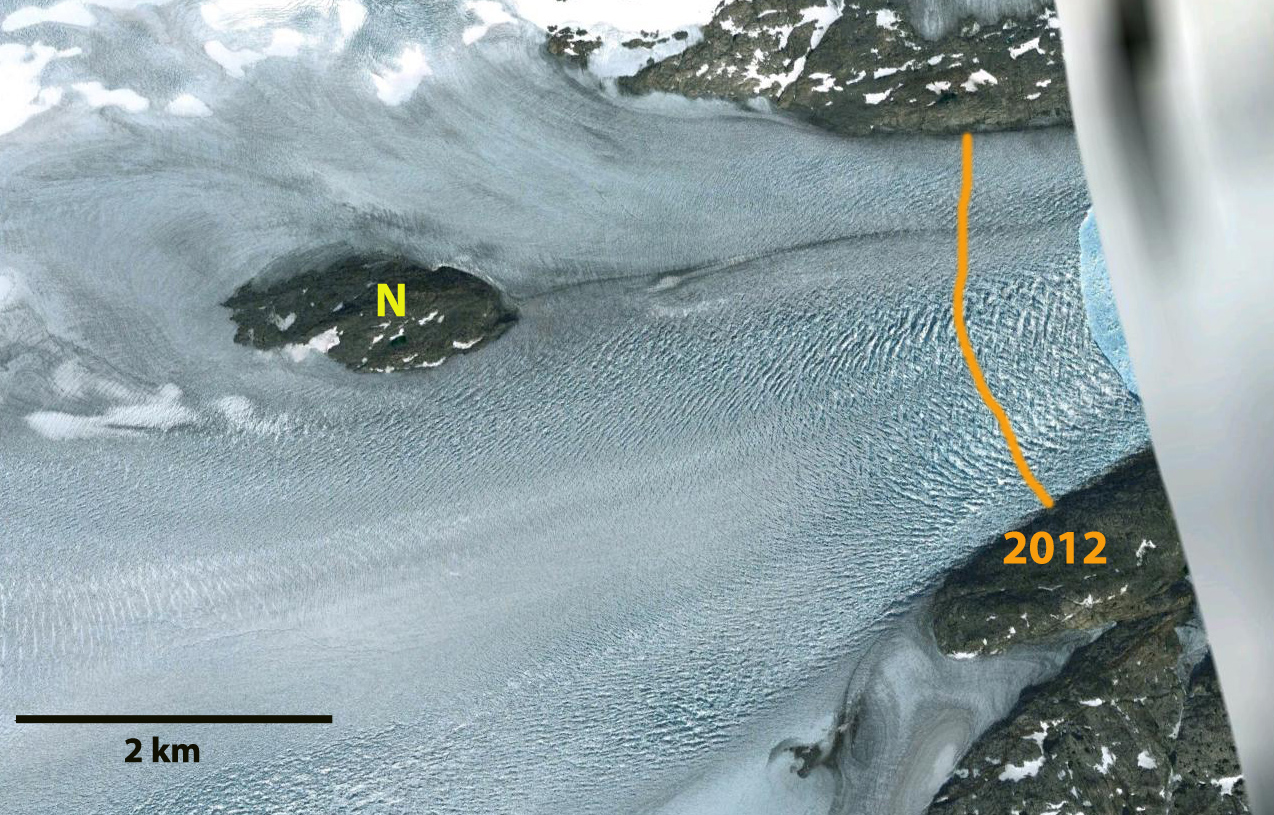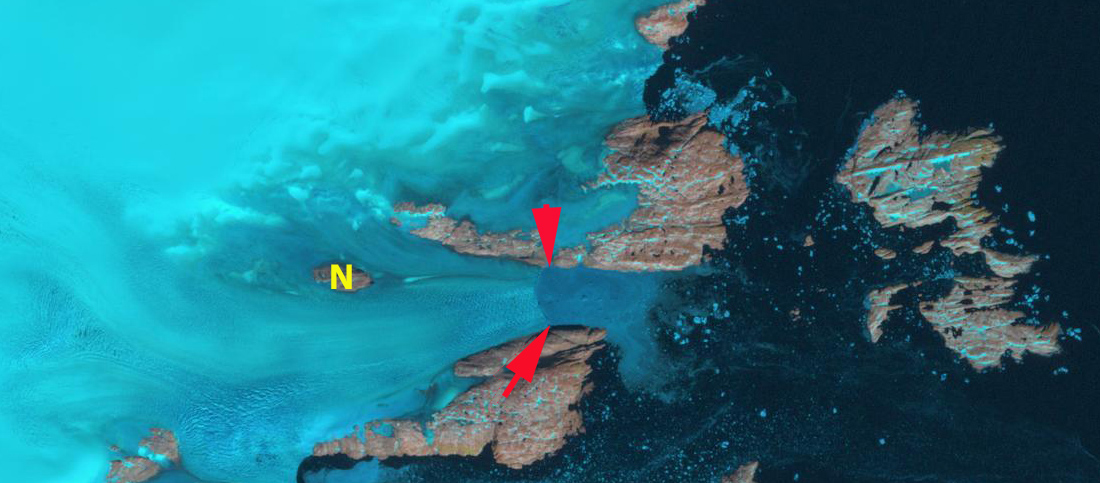 In this post we examine imagery from 1999, 2000, 2004, 2009, 2010 and 2012 to portray the terminus change. The red arrow in each image indicates the 1999 and 2000 terminus position, which coincides with a prominent feature on both the north and south side of the fjord. The Yellow N denotes a nunatak. In the 1999 and 2000 Landsat imagery the nunatak is 5.2 kilometers from the ice front, at the calving front the fjord is 2.1 kilometers wide. By 2004 in a Google Earth image the glacier nunatak is 4.0 kilometers from the ice front and the fjord at the calving front is 2.4 kilometers wide. This is a 1.2 kilometer retreat in four years. By 2009 in a Geoeye image, the nunatak is 3.5 kilometers from the ice front. By 2012 the ice front is 3.2 kilometers from the ice front. The retreat from 2000 to 2012 is 2 kilometers, just as Howat and Eddy (2011) noted. The fjord at the calving front is now 2.7 kilometer wide and will expand to 3.1 kilometers wide as the glacier retreats another 700 meters. The increasing width of the calving front, will increase the calving rate encouraging continued rapid retreat at least until the nunatak is reached after a further 3 kilometers of retreat. The complicating feature in this case is a separate terminus on the south side of the glacier, green arrow, that seems to be capturing part of the flow of the Puisortoq North Glacier and could well merge with the northern terminus, red arrow, after a 4 to 5 km retreat. In the last image the blue arrows indicate flow paths, and the black arrows a chaotic region of crevassing, where the stresses are pulling the ice in different directions. This glaciers behavior is similar to that of Thyrm Glacier and Apuserajik Glacier