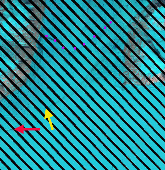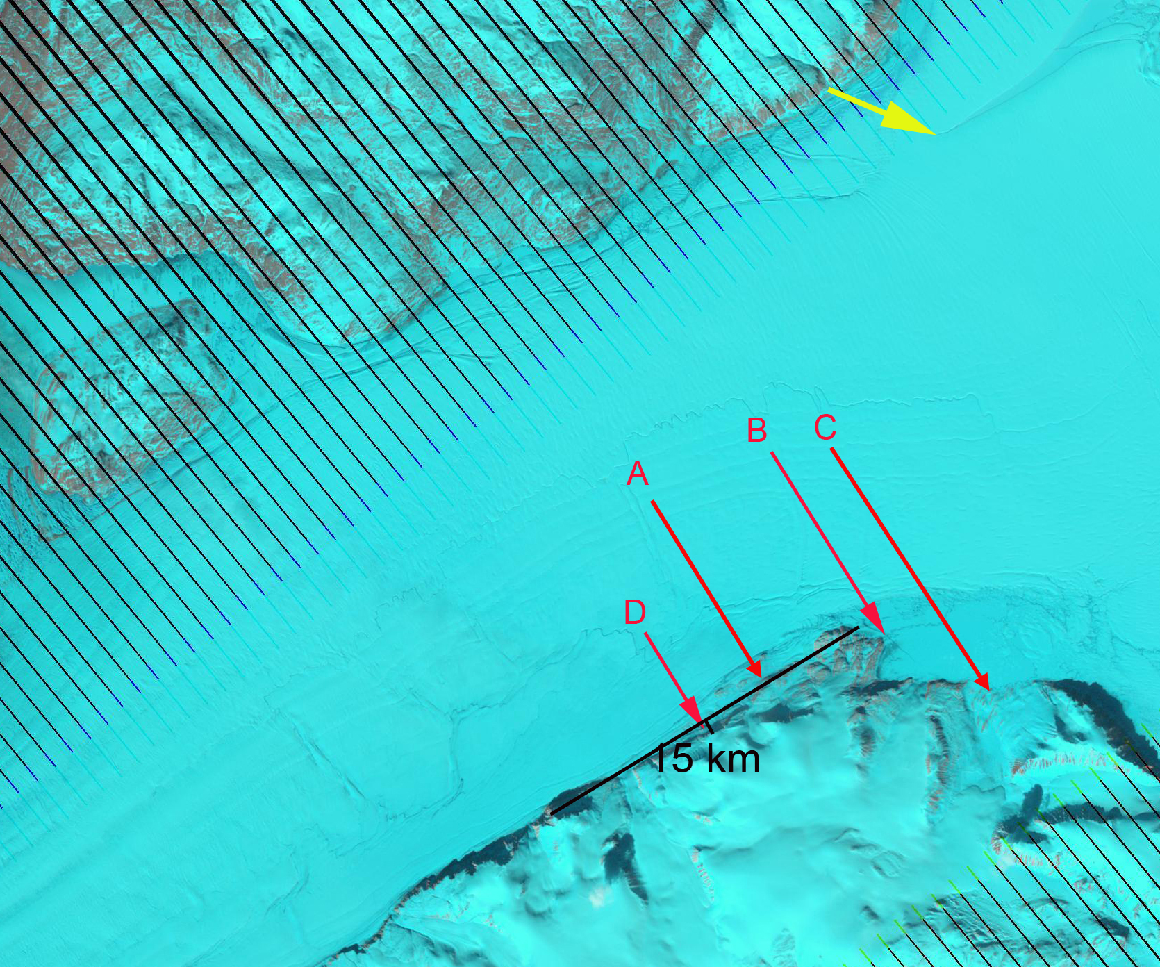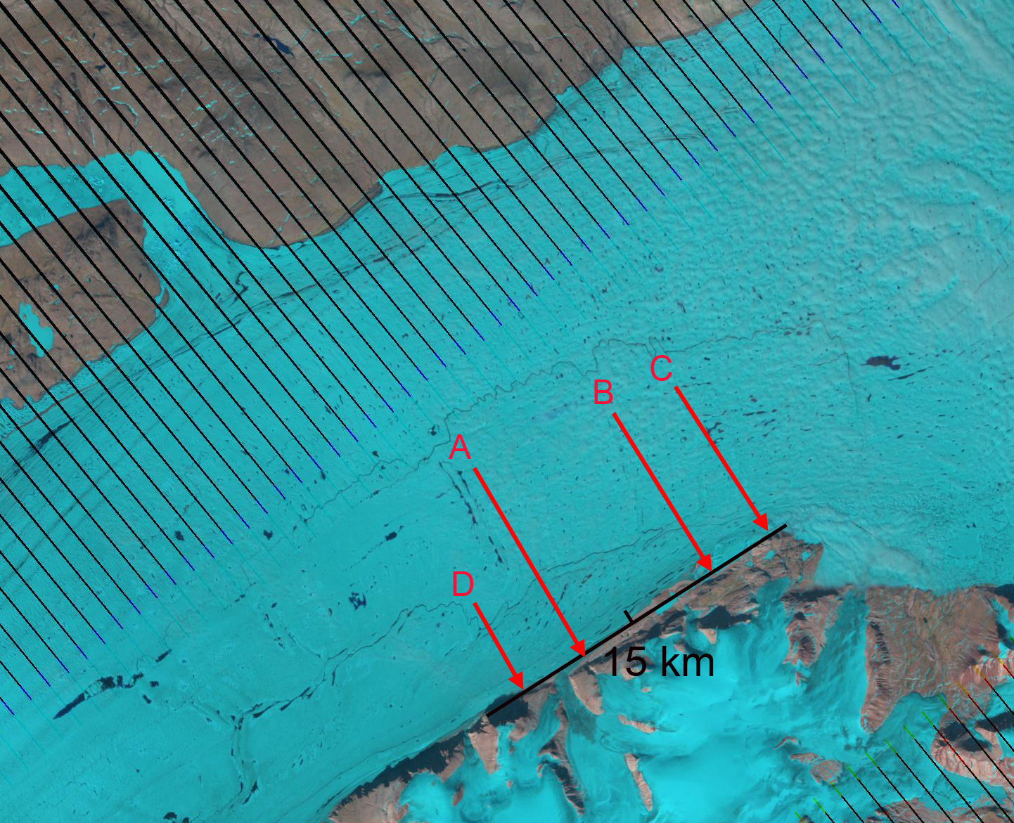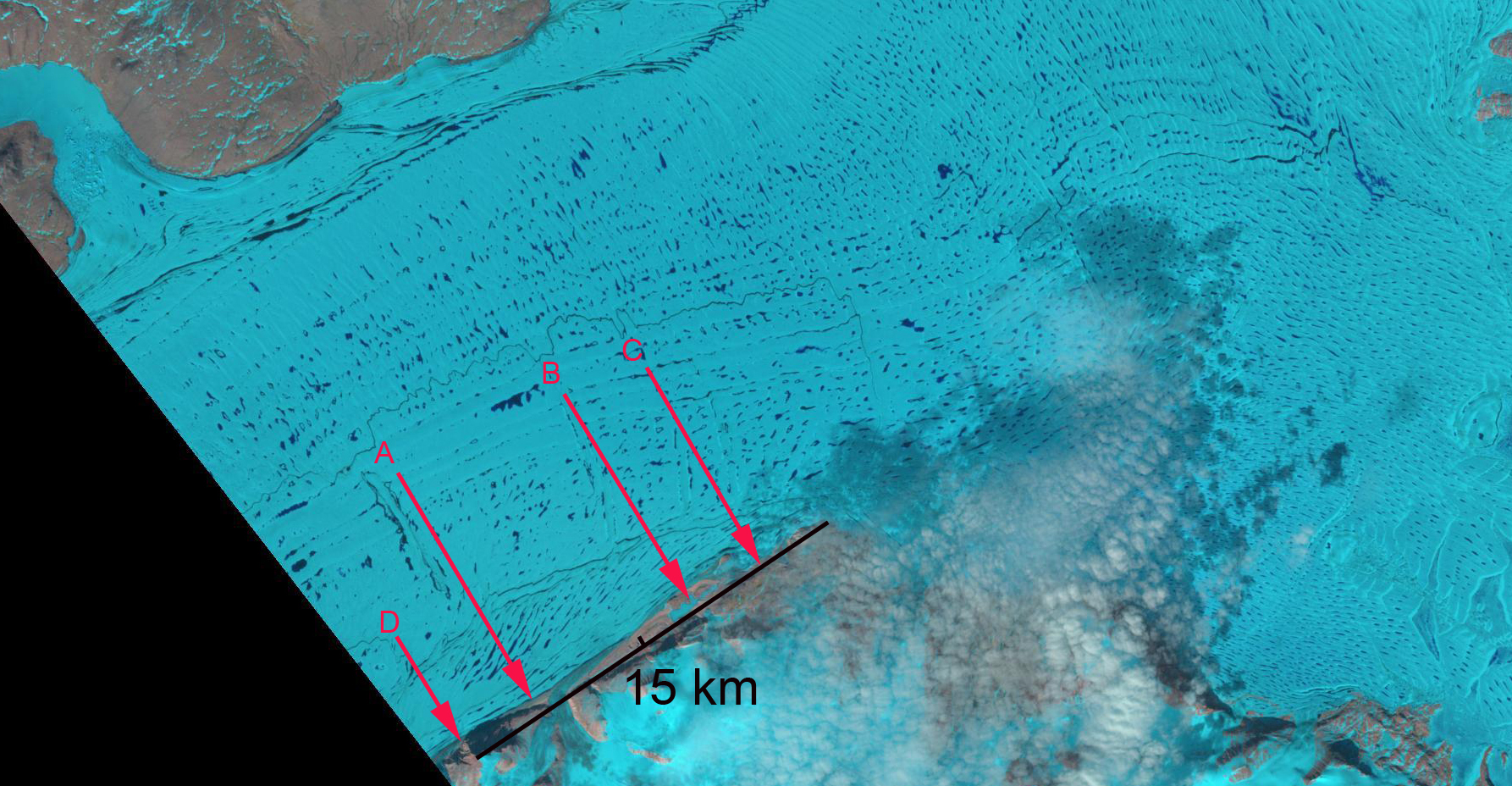 Here we pay particular attention to a section of the glacier that is 20-40 km from the calving front. A series of Landsat images from 2001 to 2013 track specific features as they move down glacier. The features A-D are each adjacent to specific unique features, specific meanders in two supraglacial streams. The movement of these features indicate the velocity over the 12 year period in this region, approximately 600 m/year. This agrees with the more detailed analysis of Seroussi et al (2011) , Thomas et al (2009) and Thomsen et al (1997). Further the spacing of these points has not changed indicating that the glacier in this region is moving as a single unit with relatively similar velocities. Further the persistence of the same streams and the ponds indicates The surface melting has led to development of numerous ponds and streams on the surface of the glacier. The lack of drainage of these features indicates the lack of crevassing, rifting or moulins to deliver water to the base of the glacier. The Petermann Glacier had several prominent rifts running transverse to glacier flow, that were clear weaknesses that would lead to future calving. 79 Glacier lacks such large rifts, just upstream of Point A is a prominent feature that at least at this point is not a rift. Pat Lockerby has noted these features in MODIS, but given the lack of water drainage and distinct break, these are not currently cracks.