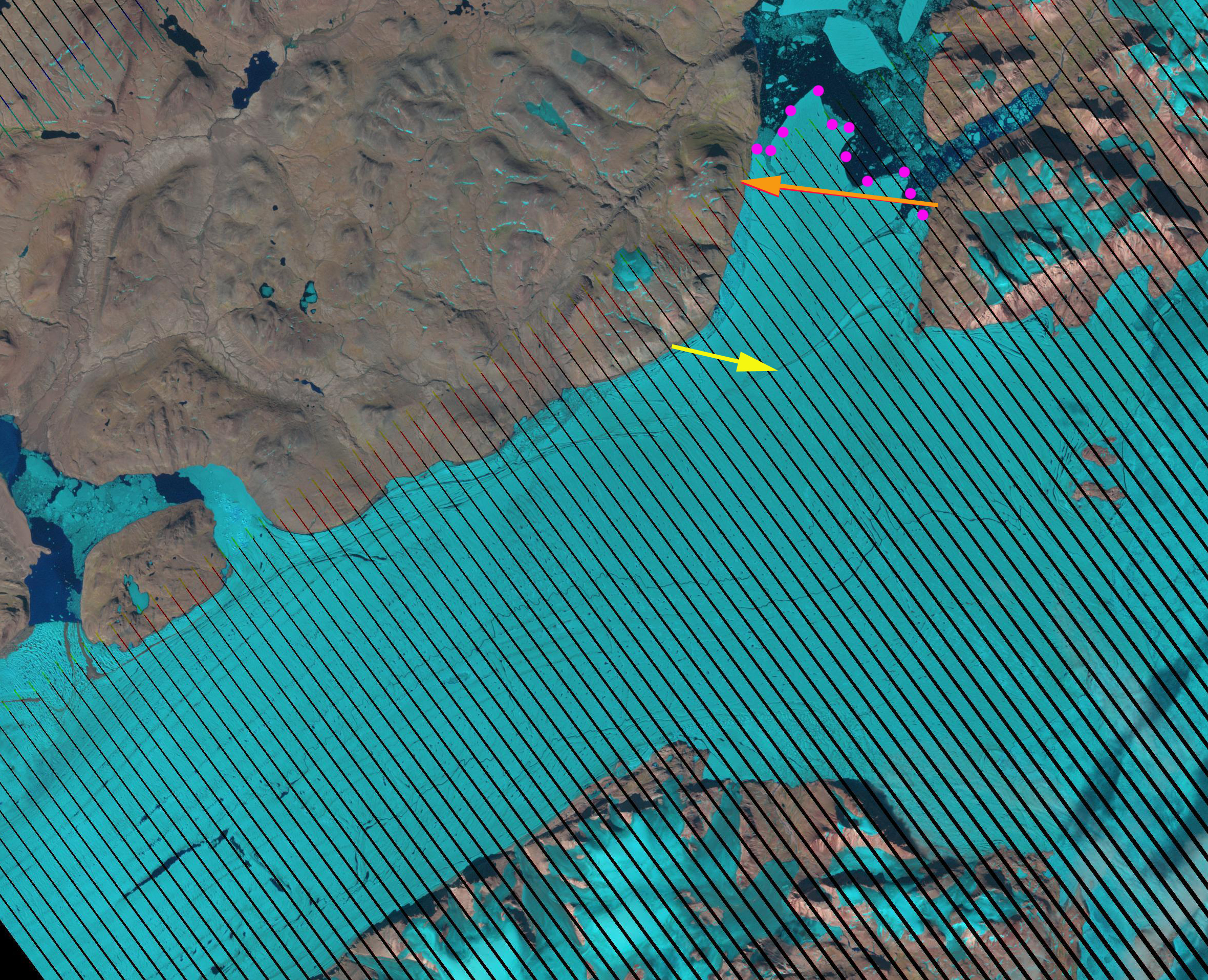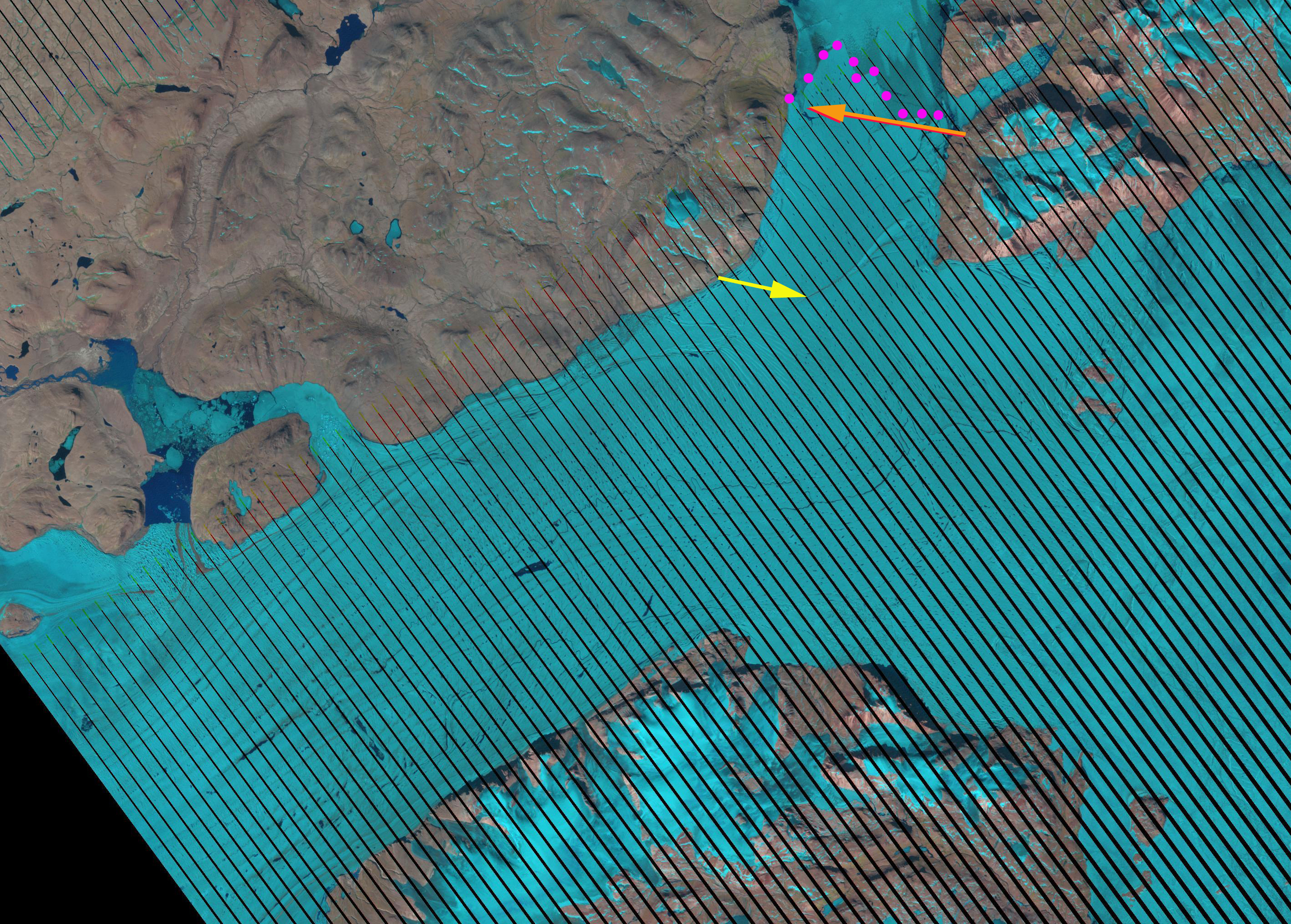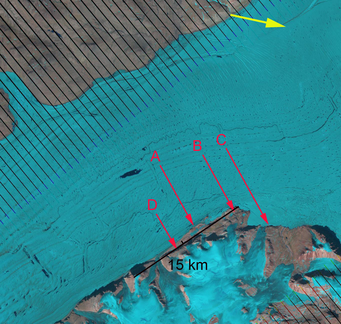 June 16, 2013 MODIS image, yellow and red arrows indicate two rifts at the start of Spaltegletscher.