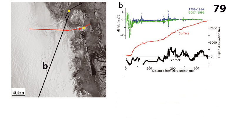 Bedrock Profile, surface profile and thickness change on a 79 Glacier Profile (Thomas, et al, 2009).