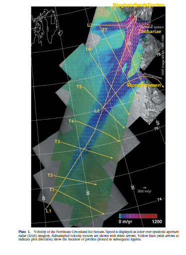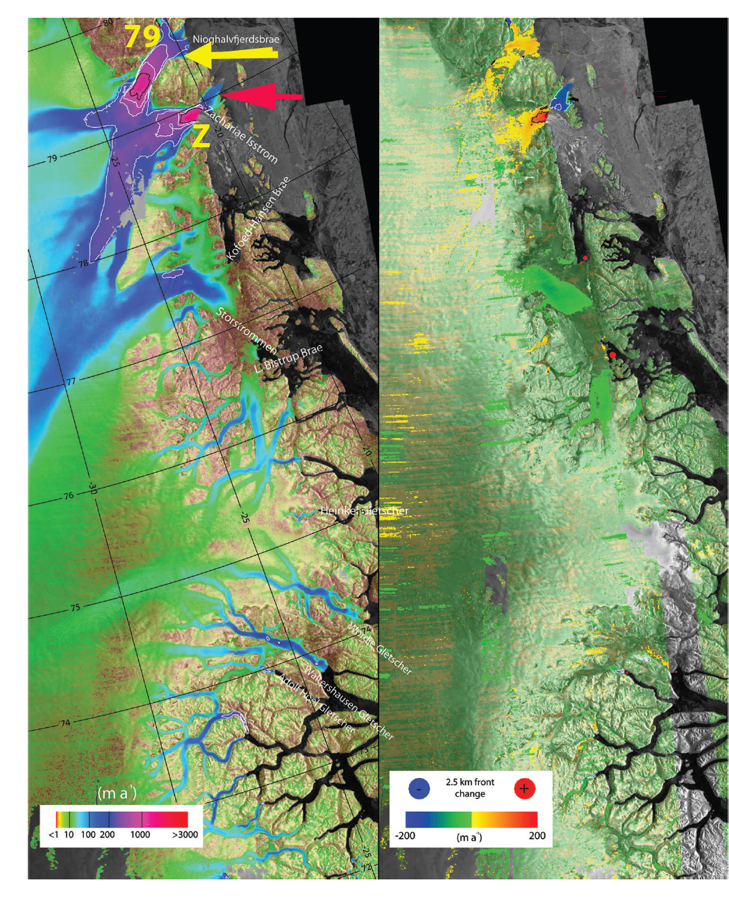 Velocity of 79 Glacier and Zachariae Ice Stream from Jougin et al (2010).