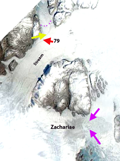 The second set of images indicates the change in terminus position at the northeastern terminus from 2000 to 2011, purple dots, often referred to as Spaltegletscher. The yellow arrow indicates a longitudinal rift that has developed since 2000 that is nearly connected to another rift near the margin of 79 Glacier. Espen Olsen at the Arctic Sea Ice Forum has suggested that this is what will lead to this area breaking off. The orange arrow indicates the same location marking the terminus of the glacier at its northwest corner. The last image is from June 16, 2013 this MODIS image indicates the two rifts red and yellow arrow at the start of the Spaltegletscher terminus. Followed by Landsat image from June 17, 2013 indicating the new terminus position more clearly and the same rifts. Another iceberg has peeled off since 2011, and the total ice loss since 2001 is 70-80 square kilometers. Jason Box, Ohio State had noted a loss of about 50 square kilometers from 2000 to 2010. Also apparent is an area of active calving and icebergs in front of Zachariae, check out the new icebergs in the June 17, 2013 Landsat atZachariae Ice Stream
