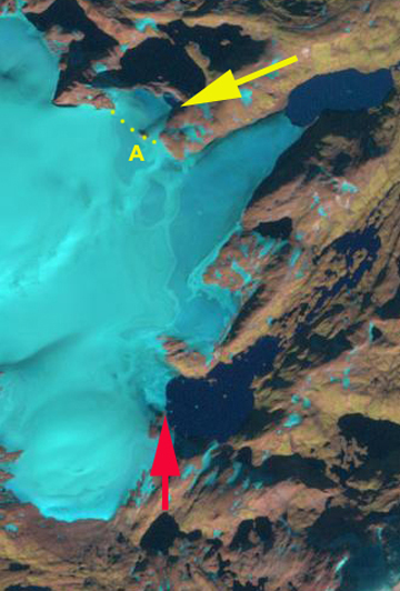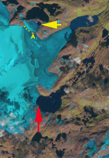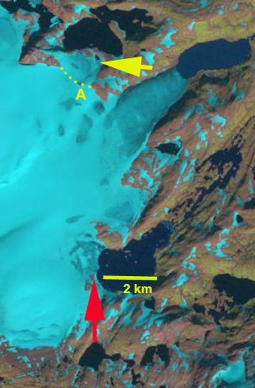 Here we examine the terminus change of two outlets one on the north side of the ice cap (yellow arrow) and one at the southwest corner (red arrow). For the northern outlet glacier three changes are emphasized. First at the terminus at the arrow point the expansion of the terminus lake from a small pond in 1994, 100 by 100 m, to a lake that is one kilometer long and 100 to 400 m wide in 2011. The progression of the lake development is steady with expansion evident in 1999 and 2006. The second noteworthy item is the ice connection of the outlet glacier to the main ice cap, yellow dots. This connection has narrowed from 1300 m in 1994 to 800 m in 2011. This in particular is apparent above Point A, which in 1994 is a bedrock knob surrounded by the glacier, a small nunatak. In 1999 Point A is still a nunatak. In 2006 the nunatak is just barely surrounded by ice, and in 2011 it is now just the extension of a ridge. The problem with the narrowing connection to the main ice cap, due to thinning ice, is less inflow, which will hasten the retreat. As is evident in 2006 and 2011 this glacier is becoming dynamically separated from the ice cap and has little retained snowcover of its own. Notice that as you cross onto the main ice cap there is no snowcover. This terminus has retreated 150 m on the west side and 400 m on the east side since 1994.