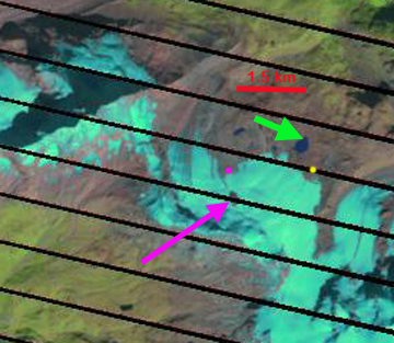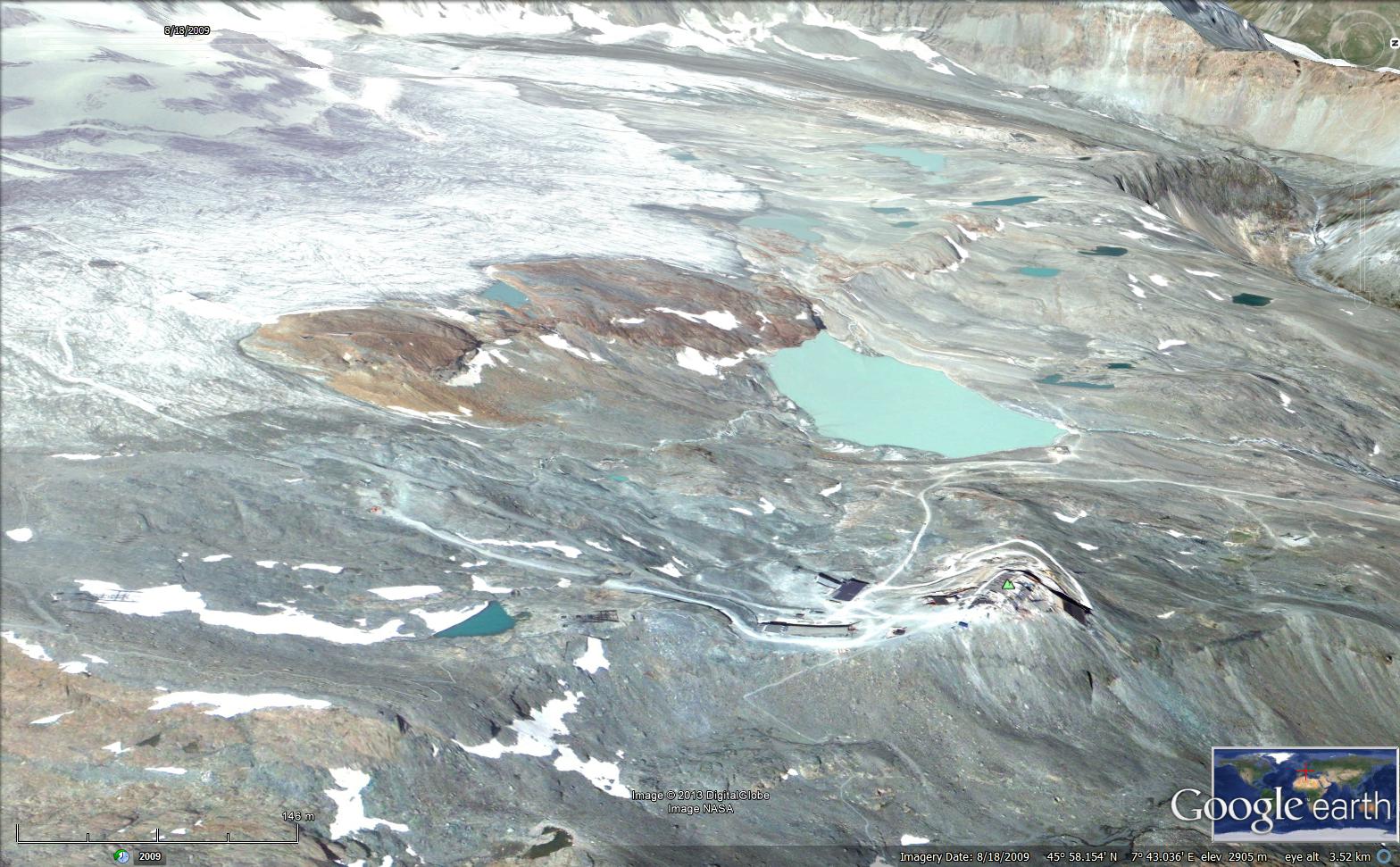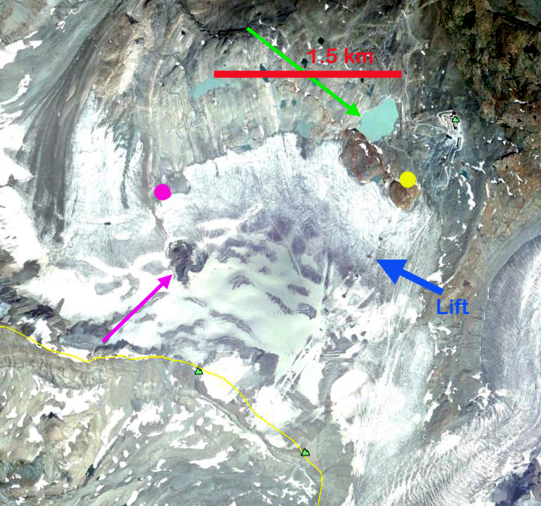 In each of the images in the sequence below and the images above the pink arrow indicates a prominent rock knob in the midst of the glacier, the pink dot below this knob is the glacier terminus, the green arrow indicates a small reservoir, and the yellow dot a location adjacent to the 1999 terminus below a rock knob. It is quite evident that the distance from the rock knob to the terminus, pink dot has changed dramatically in the 13 years 1999-2012, from 850 m to 450 m. A 400 m retreat of the west side of the Theodulgletscher in 13 years. The eastern side near Trockener Steg has experienced less retreat, with 140 m of retreat near the yellow dot. This is partly due to the grooming of the ski runs, where the compacted snow does not melt off as fast, last image. The glacier is quite thin across the entire front indicating retreat will continue.The daily web cam pictures from the top of the Matterhorn Glacier Paradise show the Theodulgletscher, though not that clearly. This identifies the day when the lower glacier loses its snowcover. This was July 19th in 2012 and August 2nd in 2013.