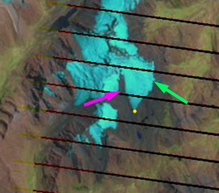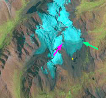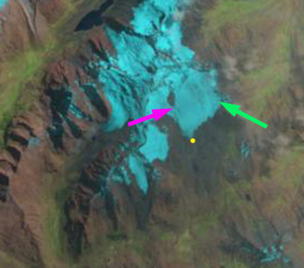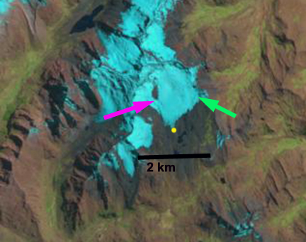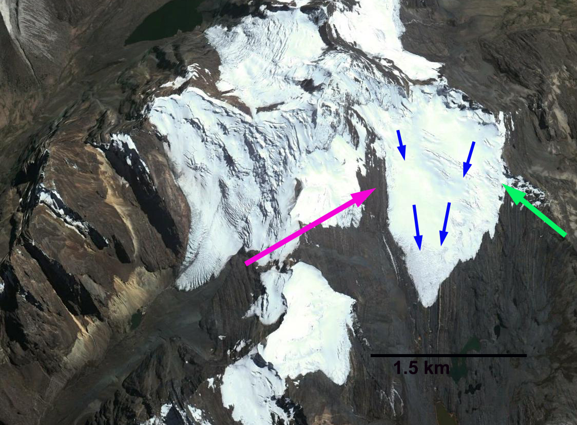 In each image the yellow dot marks the terminus, the pink arrow the same location on the west side of the glacier and the green arrow the same location on the east side of the glacier. In 1992 the terminus almost reaches a small lake beyond the glacier margin. The west margin indicates a wide connection of the glacier to slopes on the west side of the glacier. In 1999 and 2000 the glacier has retreated 150-200 m, the glacier still has a connection on the west side of the glacier. In the east side the glacier extends to the ridge east of the glacier even at the terminus. By 2013 the glacier has become disconnected from the slopes to the west of the glacier, pink arrow, the separation is a key sign of glaciers in disequilibrium. On the east side of the glacier the glacier has retreated from the east ridge at the terminus, green arrow. The losses in area along the lateral margins exceeds the retreat of the main margin, yellow dot. The main terminus retreated 250 m from 1992 to 2013. The impact of these glacier changes was assessed by USAID (2011). Other glaciers in the region are retreating in a losing mass Shallop Glacier Gurgiser et al (2013) and retreating: Quebrada Carhuascancha Glacier, Corihuasi Glacier and Chuecon Glacier in Cordillera Centrale adn Artesonraju Glacier similar fashion