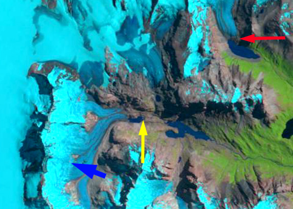 Marconi Glacier, Argentina is one of the more common routes onto the Southern Patagonia Ice Cap (SPI) via Marconi Pass. The glacier is not fed by the ice cap itself, unlike the Glaciar Chico just to the north. The glacier drains into Electrico Lake and Rio Electrico. The good news is despite the name Rio Electrico will not be developed, since it is in Parque Nacional Los Glaciares, Argentina. marconi ge Here we examine changes in the glacier observed in Landsat imagery from 1986 to 2012. In 1986 the glacier ends in the valley bottom, without a proglacial lake km from Electrico Lake, yellow arrow. Two neighboring glaciers one ending in a lake, red arrow and one on the valley wall pink arrow are noted. By 2002 Marconi Glacier has retreated 450-500 m exposing a new lake that it terminates in. The snowline blue arrows is at 1100 m. The glacier on the valley wall has retreated leading to a new lake forming, pink arrow. By 2011 Marconi Glacier’s retreat is 800 m since 1986 and it is still ending in the new expanding proglacial lake. The snowline is again close to 1100 m, though this is not the end of the summer. The glacier terminating at the red arrow has now retreated from the lake it ended in. In 2012 Marconi Glacier appears to be close to exiting from the proglacial lake. There is an excellent image of the terminus of the glacier in 2012 from useless conquests, a blog I find useful, that indicates the tenuous connection to the lake. Overall retreat from 1986 to 2012 is 800-850 m.