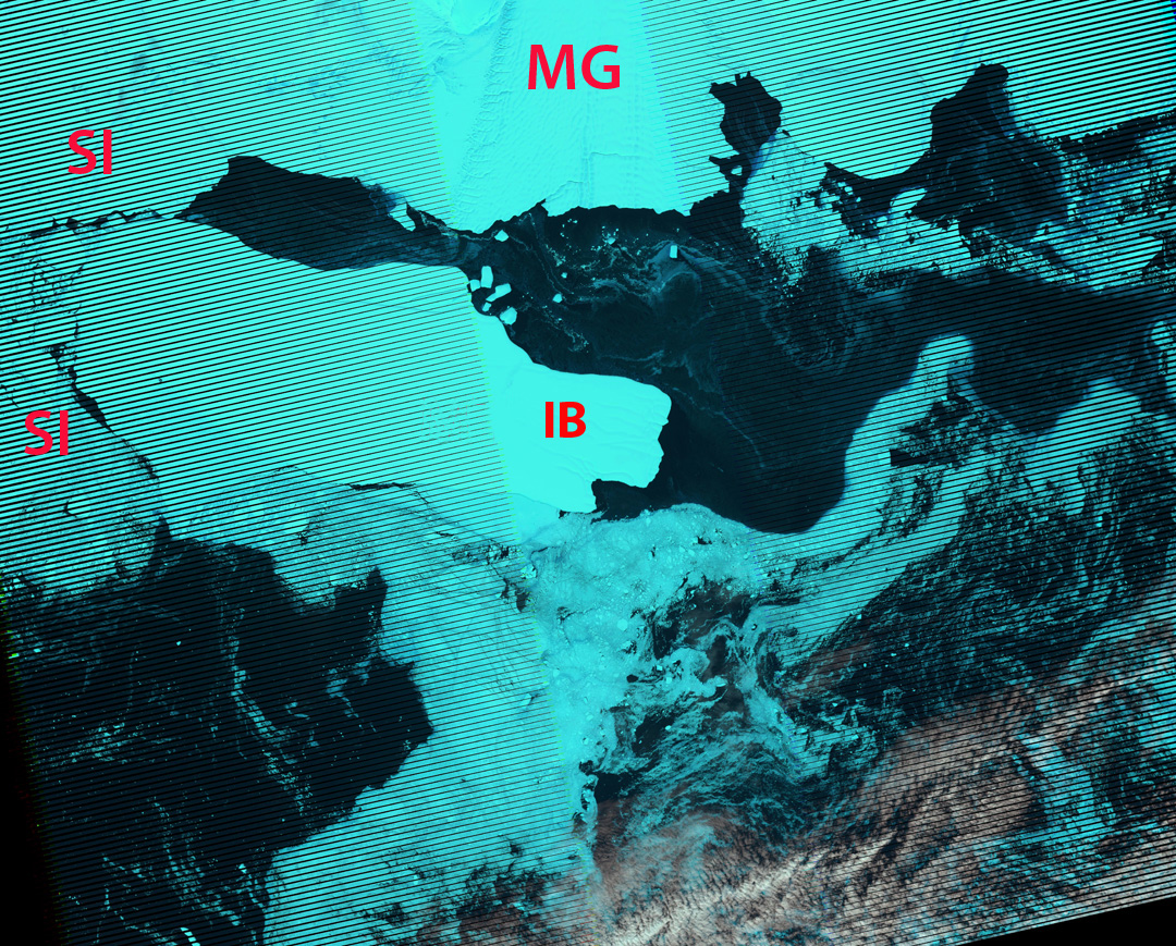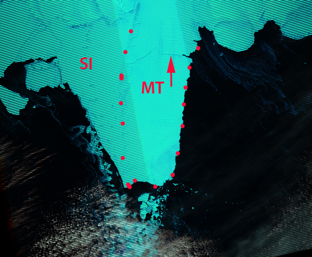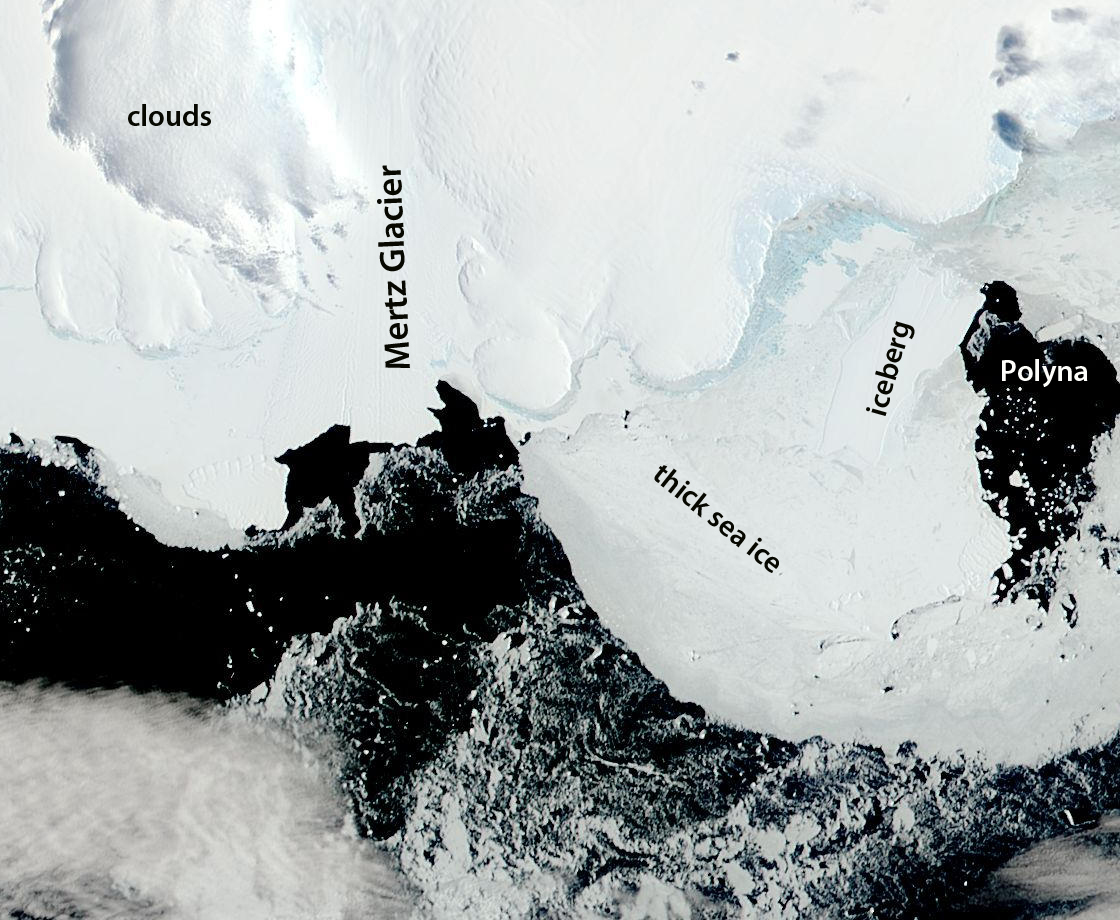 Tamura et al (2012) noted that the abrupt change to the regional icescape resulted in decreased polynya activity and sea ice production. Calving of the Mertz Glacier Tongue (MT) in February 2010 altered the regional distribution of ice and reduced the size and activity of the polynya. Shadwick et al (2013) noted that the calving of the Mertz Glacier Tongue altered the regional distribution of ice and reduced the size and activity of the Mertz Glacier polynya. In the years after the calving event there was a breakout and melt of thick multiyear sea ice released by the movement of iceberg B9B and the MT. The sea ice that was stable on the east side of the Mertz Glacier tongue, broke out from the coastline, and continues to not be as develped as before. Here we examine the floating tongue in Landsat and MODIS imagery from 2001-2013. In 2001 the floating had a rift crosscutting 30% of the eastern side of the ice tongue. By 2003 the rift had completely crossed the ice tongue. East of the tongue note the area of sea ice (SI). In 2007 and 2008 little has changed, again note the sea ice pinned to the east side of Mertz and the lack of sea ice to the west of the glacier. Than in 2010 and 2011 the tongue is broken off, and is not in view. The B9B iceberg is still in view (IB). The main change is the area of sea ice east of the former tongue is no longer as extensive and the open water west of Mertz Glacier is now has considerable sea ice. On January 3 2014 MODIS imagery indicates the extensive sea ice that exists west of the Mertz Glacier, and the region where both the Russian vessel, Akademik Shokalskiy, and Chinese vessel, Xue Long, became stuck in the ice. The vessels were stuck for ten days, broke free on January 8. Mertz Glacier is a large outlet ice stream of the Antarctic Ice Sheet. It differs from Pine Island Glacier in having lower basal melt rates, and that basal topography beneath the ice stream does not remain deep well inland of the coastline.