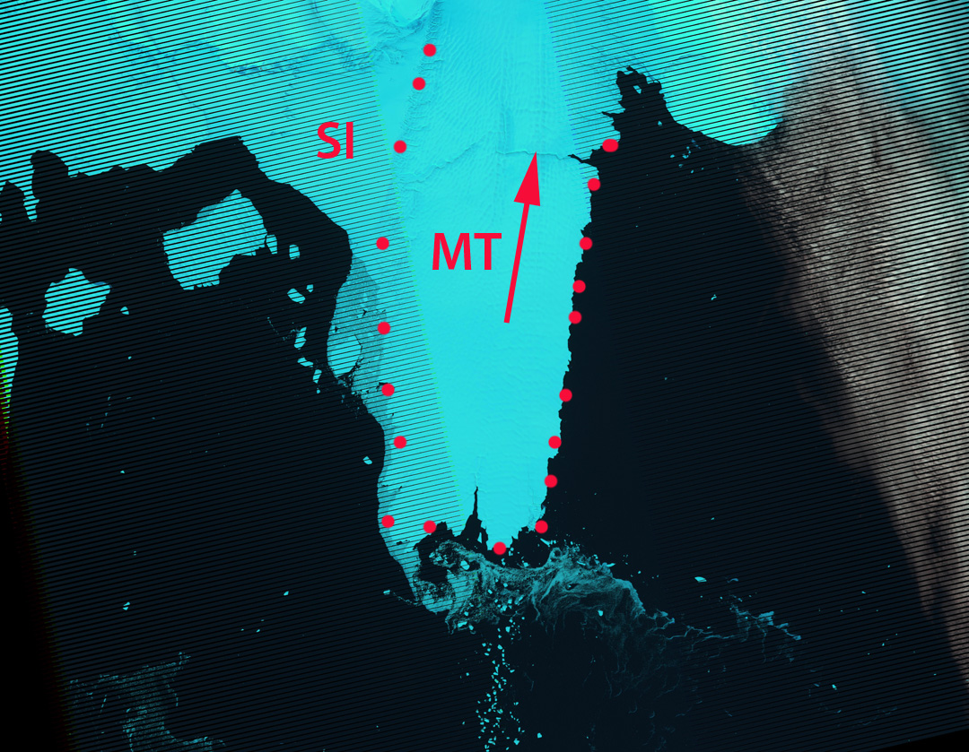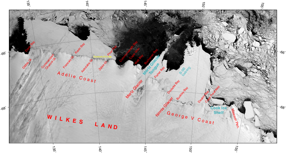 The Mertz Glacier emerges from the mountains in East Antarctica in King George V land. The glacier is a true ice stream accelerating as it enters a pronounced trough. Berthier et al (2003) indicate an acceleration from to 100 m to 1000 meters/year as it enters the ice stream reach. The glacier then extends into the ocean with a floating tongue. This floating tongue advanced from 1956 to 2010 a distance of 43 km without calving indicating again a velocity of close to 1 km per day (Berthier et al, 2003). The floating ice tongue has only two means of losing ice calving and basal melting. Berthier et al (2003) indicate basal melting of 11 meters/year. Depoorter et al (2013) indicate that basal loss is small compared to calving flux for Mertz Glacier, this is due to lower melt rates than under other ice shelves and ice tongues. The tongue was impacted by the B9B iceberg causing the Mertz Glacier tongue to calve off an iceberg that was 78 km long and 35 km wide(Young et al, 2010).