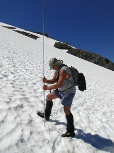 HPS-12 Glacier in 1985 and 2017 Landsat images. The red arrow indicates 1985 terminus, yellow arrows the 2017 terminus, purple dots the snowline and 1-4 are tributaries. By 2017 all tributaries have detached and the glacier has retreated 13 km. HPS-12 is an unnamed glacier draining the west side of the Southern Patagonia Ice Cap…