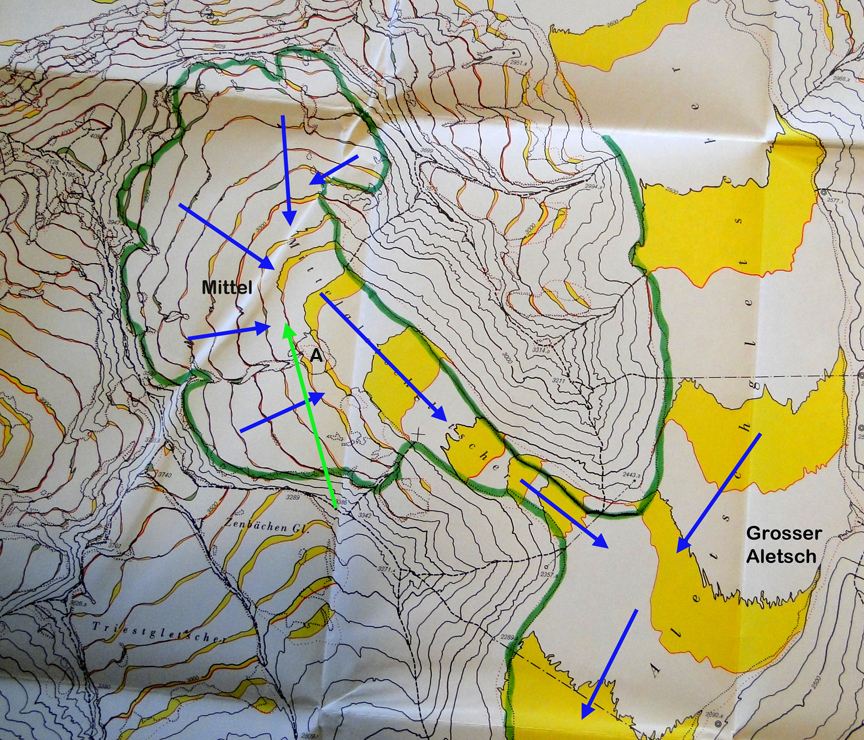 Mittelaletsch Glacier was a tributary to the Alps largest glacier Grosser Aletsch, until separation in 1990. The map of the glacier represents changes in the glacier from 1926 to 1957, indicating the connection of the two glaciers at that time. By 1970 Mittel had separated from Grosser, and experienced 420 m of retreat from 1970 to 2000 as noted by the Swiss Glacier Monitoring Network.
