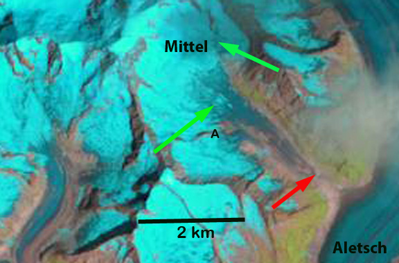 Here we examine changes in the glacier using Landsat imagery from 1990 to 2013. In each image an upper and lower green arrow point to the same location where expanding bedrock areas are separating the upper and lower portion of the glacier. Point A is at the lower end of a prominent rock rib. In 1990 the glacier ends at the red arrow separated from Grosser Aletsch by 600 m. At the lower green arrow the glacier is flowing across this slope contributing snow and ice to the lower glacier. In 1999 the area of exposed bedrock between the upper and lower glacier has expanded by at least 500 m at both green arrows. By 2007 Google Earth imagery indicates a continued expansion at the lower green arrow. The glacier terminates at the yellow arrow 1050 m from a connection to the Grosser Aletsch Glacier. The lower 1 kilometer of the glacier is stagnant as seen in the closeup view of the terminus, pink arrow indicates start of stagnant section. In 2013 the glacier has retreated 1400 m from the Grosser Aletsch Glacier, terminating at yellow arrow versus 1990 terminus red arrow. The margin of the Grosser Aletsch has contracted 150-200 m, hence the actual retreat since separation is 1200-1250 m. By 2013 at the lower green arrow the bedrock strip separating this section of the upper and lower glacier has expanded to a length of 1 km. This is equivalent to a company losing income from an important division, or a family losing one income stream. The lower glacier is recieving less snow and ice contribution and will continue to retreat, quickly loseing the stagnant area the comprises the lowest 700-100 m of the glacier. Jouvet et al (2011) reconstruct the behavior of the Aletsch Glacier system to various climate scenarios and find that any scenario leads to 2 km of retreat by 2040 for Grosser Aletsch and somewhat less for Mittelalestch. This glaciers behavior is similar to that of nearby Gauli and Oberaar.