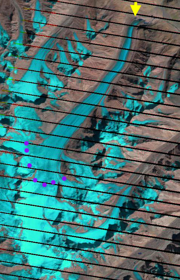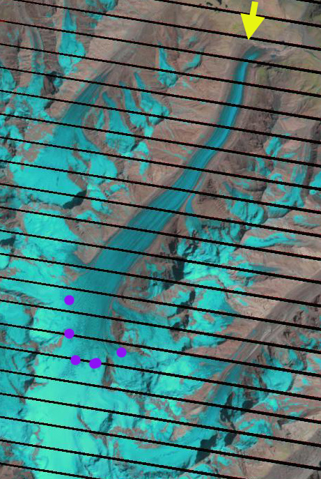 Landsat images from 2005 and 2013 indicate the snowline on the glacier as well as the change at the terminus. In 2005 and 2013 the snowline is at 5100 m, purple dots. Given that the glacier extends from 6000 m to 4100 m this is near the median elevation, but this is also likely not the date of highest snowline position. The retreat of Durung Drung Glacier is similar to the more debris covered Gangotri Glacier and Satopanth Glacier but slower than the similarly debris limited Malana Glacier and Samudra Tupa Glacier