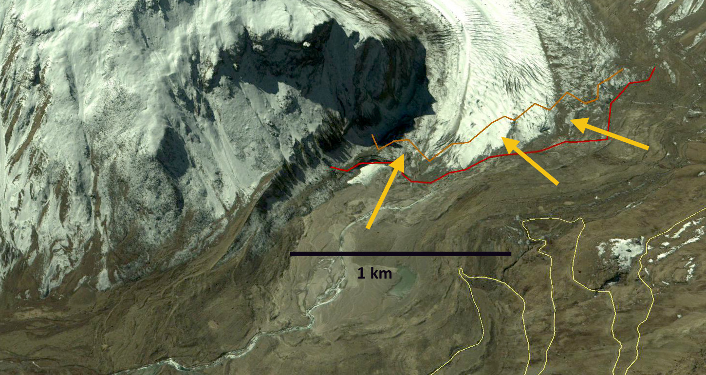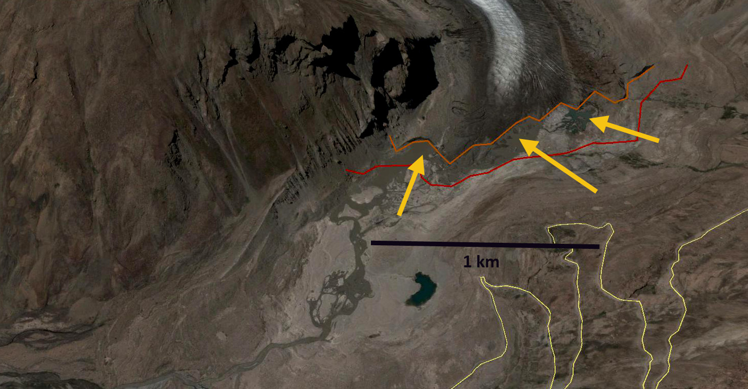 There have a few inaccurate reports of late that this glacier is not currently retreating. Here we examine Landsat and Google Earth imagery from 1998 to 2013 to identify the magnitude of the recent retreat. In Landsat images in 1998 there were no evident proglacial lake at the terminus of the glacier, red arrow. By 2013 a series of proglacial lakes are evident in Landsat images at the terminus red arrow. Looking at the higher resolution Google Earth imagery from 2004 and 2013. The retreat and development of the lakes is apparent. In each image the red line is the 2004 terminus and the brown line the 2013 image, orange arrows indicate three lakes that have formed by 2013. The retreat is 200-250 m not large for a glacier of this size but significant for such a short period of time. More importantly the smooth low slope terminus with pieces breaking off into the proglacial lake in 2013 is indicative of a glacier that is thinning and retreating, note video. The lowest 1.2 km of the glacier is uncrevassed and has a low slope suggesting this area will continue to melt away. An image from a Zanskar River expedition indicates the lakes and icebergs in the lakes as well with the blue arrows indicating the low-sloped uncrevassed region.