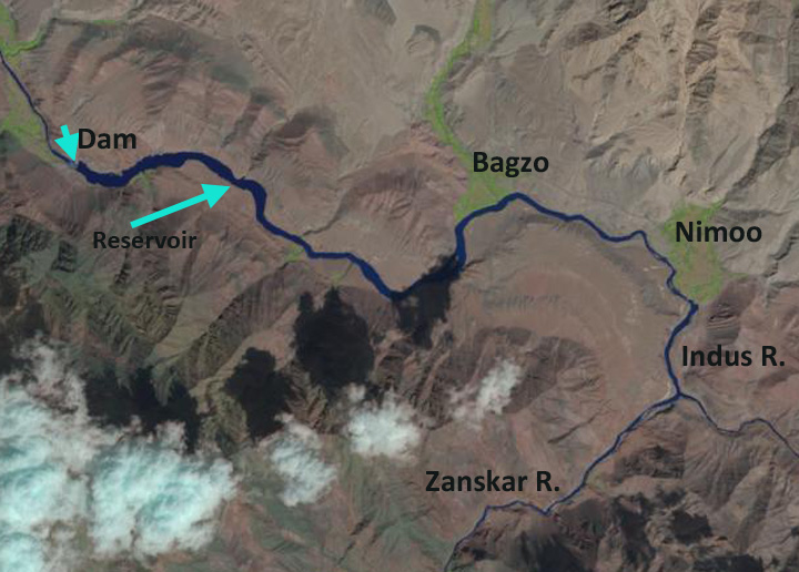 2013 Landsat image of the dam and reservoir for the Nimoo Bagzo Hydropower Project