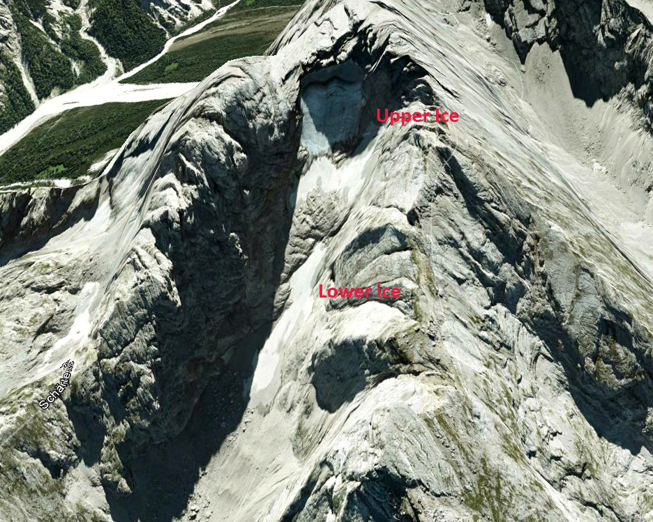 The Blaueis Gletscher is the furthest north glacier in the Alps. It occupies a narrow deep valley oriented north, between the summits of Blaueisspitze and Hochkalter. Hagg et al (2012) in an examination of Bavarian glaciers over the last 120 years note the changes in area of Blaueis Gletscher. The glacier increased in area from 16 to 20 hectares during the 1889 to 1924. Retreat from 1924 to 1970 led to a decrease in area to 12.6 hectares. Advance in the 1970’s increased the area back to 16 hectares by 1980. Since 1980 rapid area loss to 7.5 hectares by 2009. This rapid loss has led to many media reports of the imminent loss of the glacier. Here we examine imagery of the glacier from 1982-2014 to identify its current status. In 1982 the glacier consisted of the main upper reach and a thin lower ice in a photograph from R. Drescher from the Bayerische Gletscher website. By 2005 the thin lower ice has declined in area and thickness and is not connected to the upper glacier allowing ice transfer. There is some fringing thinner ice in 2005 on the lower margin of the upper ice. By 2009 the thin marginal ice at the downhill end of the upper glacier, has declined and become largely detached from the main glacier. A closeup in 2009 indicates the glacier has 45-48 annual layers of accumulation exposed at the glacier surface. This image indicates that no recent accumulation has been retained as all of the layers are blue ice and no snow or recent firn exists on the upper glacier. A glacier without consistent accumulation cannot survive (Pelto, 2010). This survival forecast method does not detail how long it will take to disappear. The number of annual layers exposed indicates the glacier thickness is still significant, further the location precludes rapid melt. Thickness maps from 2007, from the Bayerische Gletscher group, indicate the main upper ice is 5-10 m thick, with some areas over 10 m thick, based on radio echo sounding. Based on the number of annual layers and lack of crevassing reaching the glacier base, it seems to me the average thickness is somewhat greater. Glacier’s that I have worked on develop significant crevasses that reach the glacier base as the thickness drops below 10 m. Using typical volume-area scaling coefficients suggest the average thickness to be 12-15 m. There is a webcam at the Blaueis Hut that indicates the glacier today 8/22/2014 still has substantial snowcover. With the current climate this glacier in the least exposed niche on the mountain should be able to endure more than a decade.