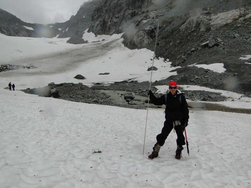 We then headed to Lower Curtis Glacier, on Shuksan where the rain gods had their turn. That night we had one of the top three heaviest rainstorms I have experienced during my 31 years and 600+ nights camping in the North Cascades. Totals by morning exceeded 4 inches. Rain continued lightly during the day, making for a foggy day on the glacier. The avalanche danger was too high due to the warm temperatures even with the rain to survey the terminus. The main basin of the glacier had limited areas with snowpack over 2.8 m, which is how much is needed in mid-August to survive to the end of the melt season. With typical late summer conditions mass balance will be -1.1 m on Lower Curtis Glacier