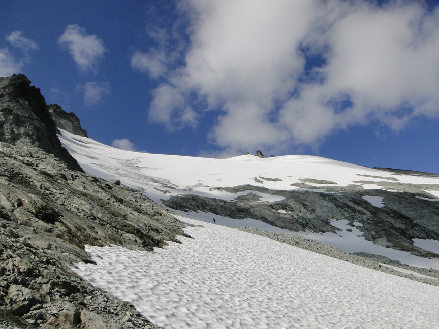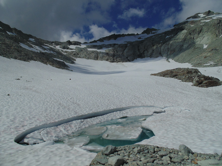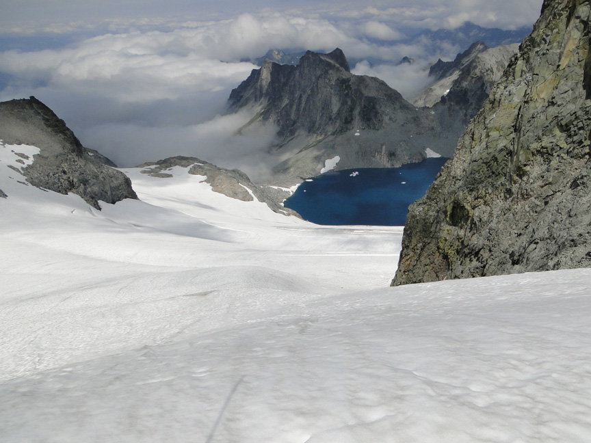 On Mount Daniel the first surprise was that Deep Lake had changed from the normal blue to a jade green. This was due to the heavy rain, even east of the crest, the previous three days, which also caused the Cle Elum River to be quite high, though the water was also warm. Having hiked passed this lake each of the last 30 years this is the first time it was not a deep blue color. It will be interesting to see how long it is until the color reverts to normal. We hiked up the Daniels Glacier to the main summit of Mount Daniel, then descended the Lynch Glacier before reascending the Lynch Glacier. Both glaciers had below normal snowpack and considerable blue ice exposure. With typical late summer conditions mass balance will be -1.2 m on Lynch Glacier and -1.1 m on Daniels Glacier. Neither glacier receives much avalanche snow. The following day on Ice Worm Glacier snowpack was above normal on the lower half of this small glacier, clearly because of unusually large amounts of avalanche accumulation. The top half of the glacier had 1-2 m of snowpack that will be lost by mid-September. With typical late summer conditions mass balance will be -0.5 m on Ice Worm Glacier