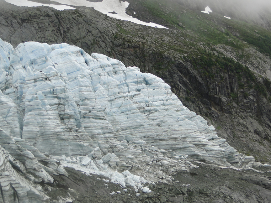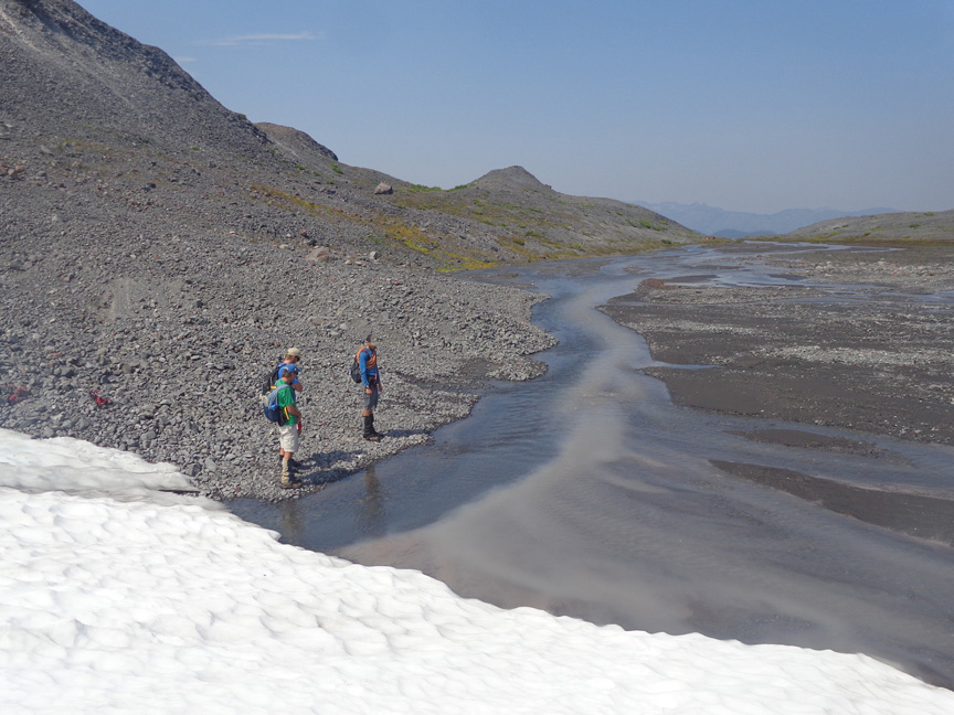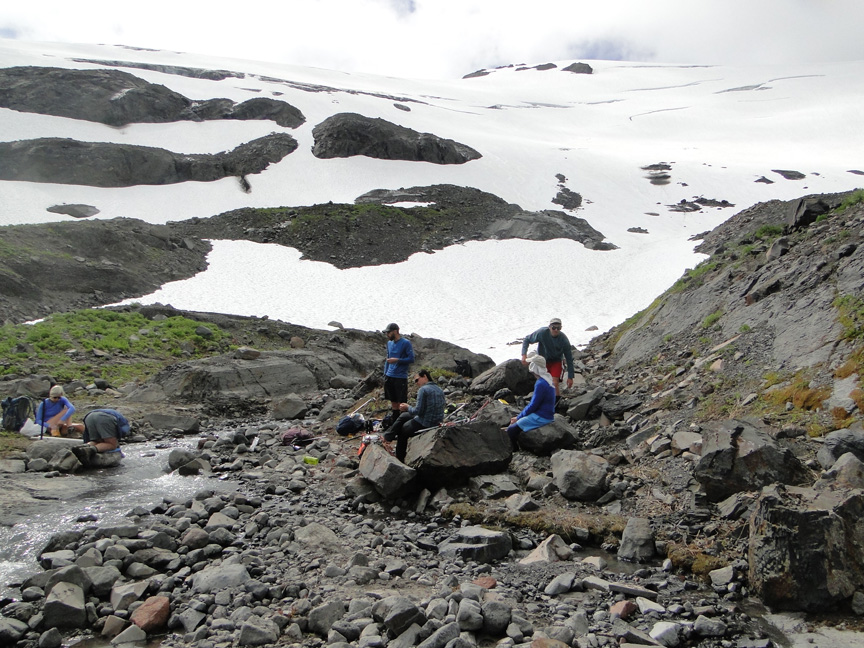 The forecast of a one day rain event was now extended to two more days. We hiked up to Blanca Lake in the rain, woke up in the rain, hiked to the glacier in the drizzle and completed our measurements. The rain returned during the hike around the lake to camp. Snowpack was low around the lake, on the trail in and seemingly everywhere but on the glacier. Strong avalanching made this the first glacier even close to average in its snowpack. Snowpack was low in the highest basin of the glacier that is not as heavily avalanche fed. With typical late summer conditions mass balance will be -0.6 m on Columbia Glacier. The warm weather was evident in the temperature of the water being much warmer than usual in the stream ford that is required to reach the glacier.