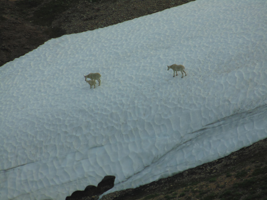Continued warm dry weather led to records numbers of hikers at Artists Point as we headed out Ptarmigan Ridge on the northeast side of Mount Baker to work on Rainbow Glacier and Sholes Glacier. During our first day the east wind pushed forest fire smoke into the area eliminating views. We surveyed the mountain goat herds as usual seeing three herds and a total of more than 60 different goats. With the high temperatures and forest fire haze the number of iceworms emerging at sunset during our population count was also an all time low. Rainbow Glacier had snowpack that was 1.25 m below normal. With typical late summer conditions mass balance will be -1.5 m on Rainbow Glacier. Sholes Glacier already had 15% blue ice exposed, on August 7th. This had expanded to 25% by August 12th. This rapidly expanded to 50% by August 23rd, note Landsat comparison below. It will be 60% by the end of August and then likely close to 80% loss by the end of the summer. With typical late summer conditions mass balance will be -1.6 m on Sholes Glacier. Remember glaciers in this area need 60% snowcover at the end of the melt season to balance their frozen checkbook. On Sholes Glacier we completed 118 measurements of 2014 snowpack depth via probing in this relatively crevasse free glacier.