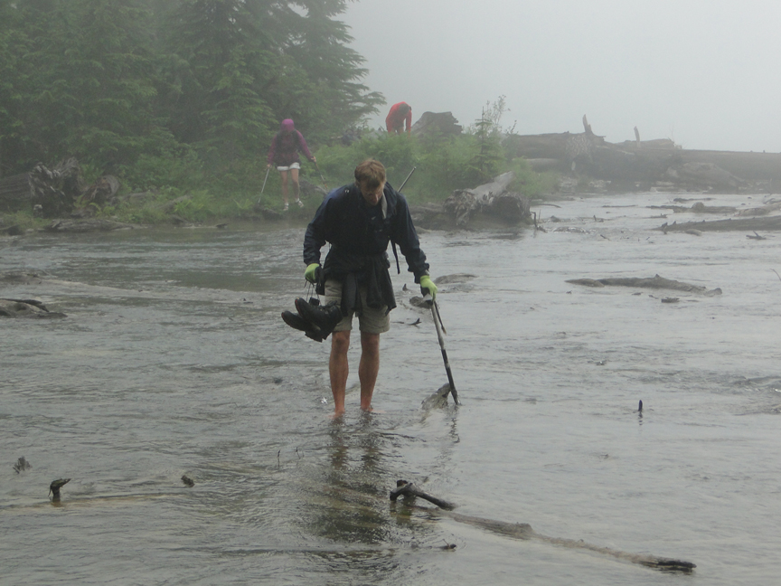 Ben Pelto in his tenth year working on the glaciers, fording stream in wet weather to access Columbia Glacier.