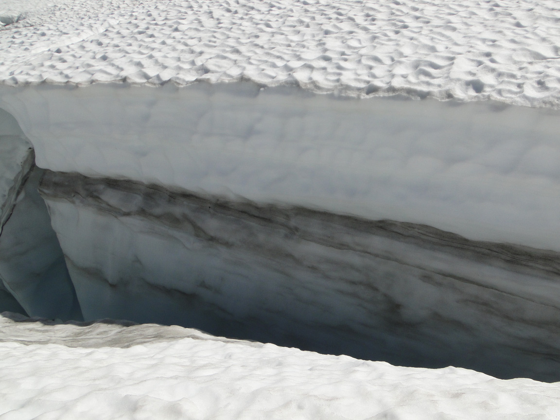 Winter snowpack was normal on Mount Baker, the record ablation then led to a large negative mass balance for the glacier of -1.8 m, but not a record loss. The ablation did lead to many significant surface streams on the glacier shown below, which drain into the glacier at moulins.