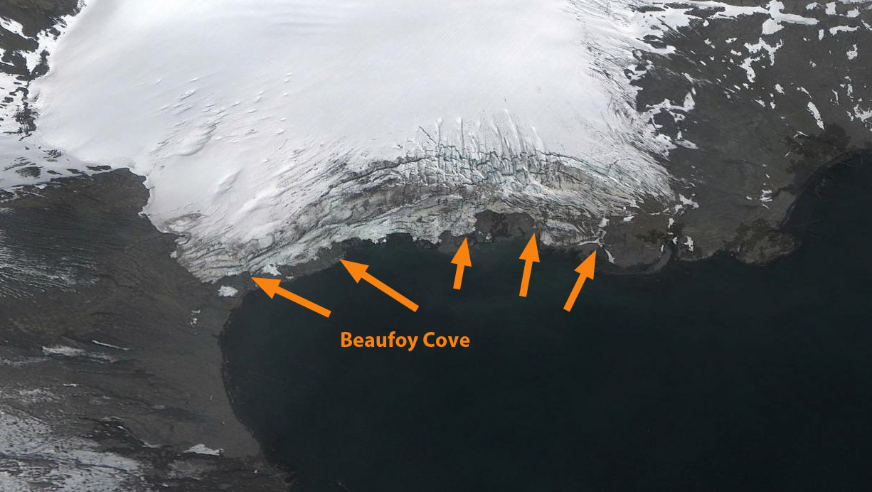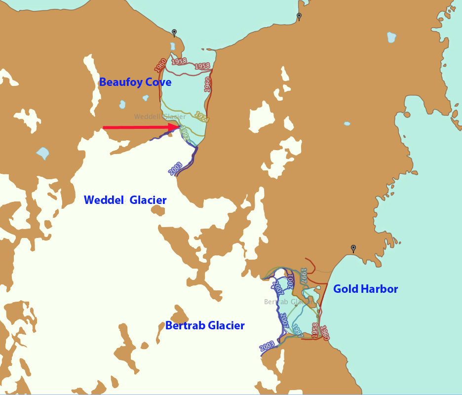 In 2002 there is only minor retreat at the red and yellow arrow, but thinning has led to the small extension of the main icefall being almost cutoff by bedrock. By 2015 the glacier has retreated 200-300 meters from the 1989 position and the main terminus is narrower. At the yellow arrow the side valley no longer has ice. At the purple arrow this is just bedrock now, there is no glacier extension flowing down the bedrock step. A close up the icefall in a 2009 Google Earth image indicates both the extensive crevassing but also the lack of glacier ice at the purple arrow, where an extension of the icefall formerly flowed. A Google Earth closeup of the terminus indicates that only a small section is still in contact with Beaufoy Cove in 2009, with land exposed at the orange arrows. This glacier is almost not tidewater and has terminated in shallow water since 1989, which helps explain a slower rate of retreat. The glacier has thinned more rapidly than it has retreated in the last 25 years. The retreat rate is less than nearby Bertrab Glacier, Konig Glacier and Neumayer Glacier on the same coast of South Georgia.