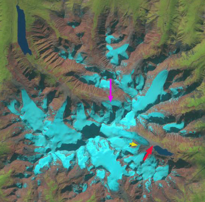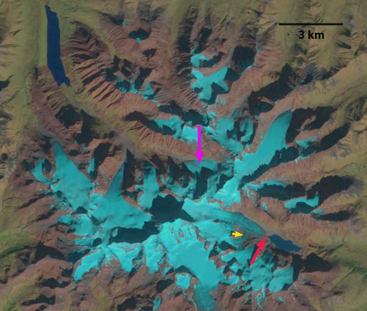 In 1986 the glacier extended to within a 100 meters of an alpine lake, with the terminus indicated by the red arrow. The glacier was joined near the terminus by a tributary at the yellow arrow. At the pink arrow a separate glacier terminus is formed by the merging of two glaciers. In 1992 the main glacier tongue has retreated further from the lake. By 2015 the tributary no longer is connected to the main glacier and terminates 600 meters above the valley. The main glacier terminus has retreated 800 meters since 1986, and is now just over 3 km long. The terminus area at the glacier flowing north at the pink arrow, is no longer formed by the merging of two glacier termini, as two distinct termini exist.