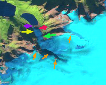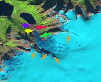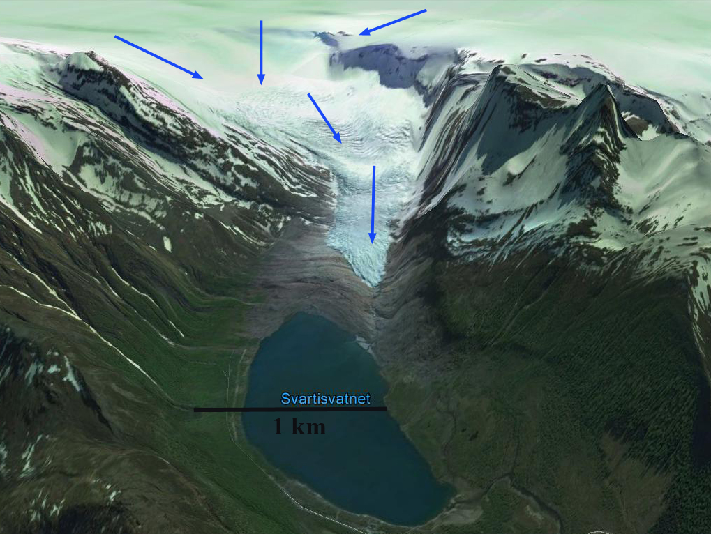 From 1990 the glacier ended at the red arrow before advancing by 1999 to the purple arrow. Retreat followed to the yellow arrow in 2015, this is a 350 m retreat. From 1999-2013 NVE amual terminus assessment indicates a retreat of 317 m.. At the green arrow the width of the glacier declined from 475 m in 1999 to 325 m in 2015. At the orange arrows thinning is evident higher on the glacier as bedrock areas have expanded. The snowline in 2014 is above these areas and is at all but one in 2015. This thinning suggest retreat will continue. The 2015 position is its point of furthest retreat since the Little Ice Age. The recent retreat indicates a recent trend of negative mass balance on the glacier. There is excellent flow off the ice cap that has persistent and consistent snowcover indicating this glacier will survive current climate. This is also leading to the retreat of Storglombreen and Flatisen from the same ice cap
