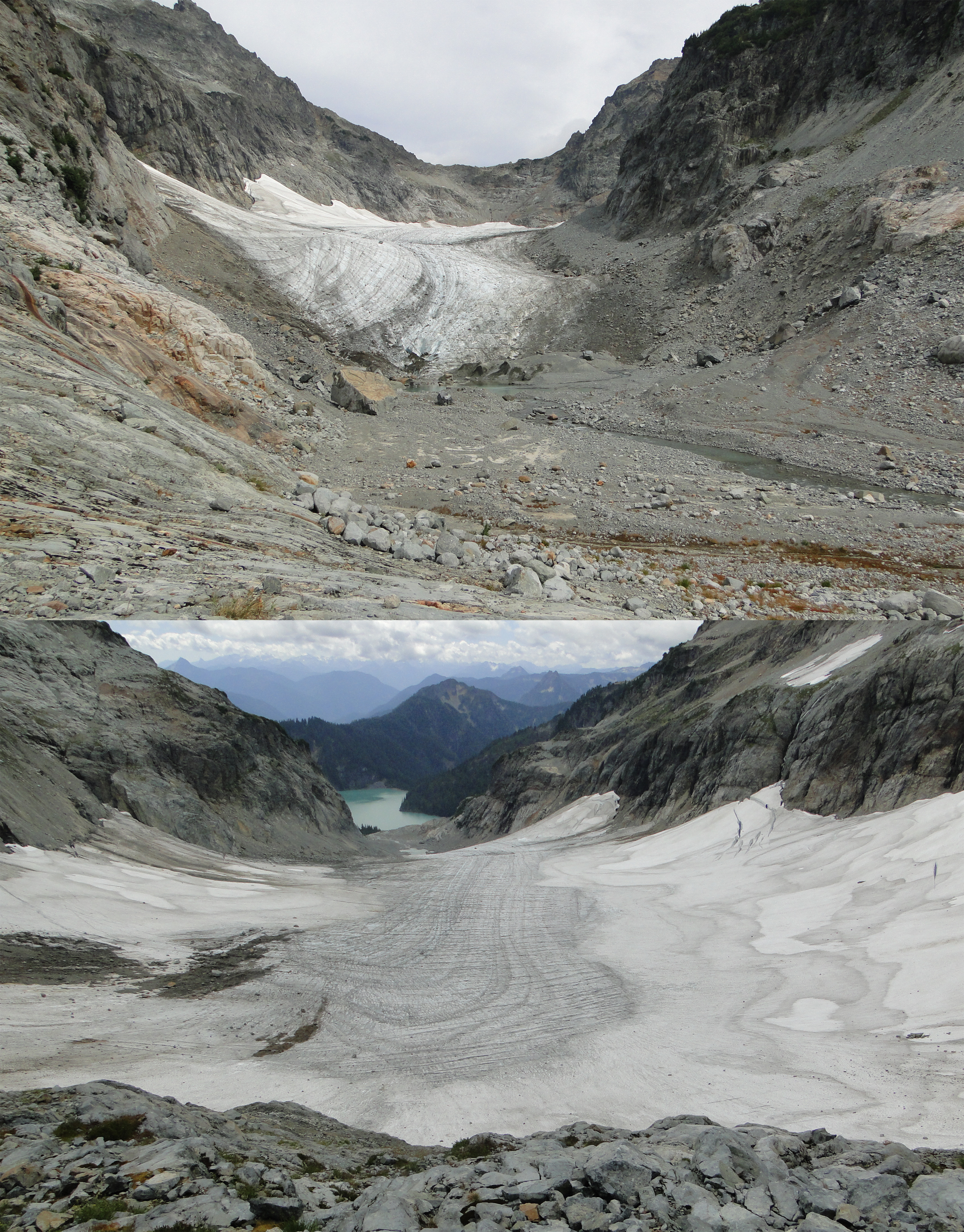 Columbia Glacier, Washington in 2015 during our mass balance observations from the terminus and head of the glacier indicating the lack of snow cover retained and extensive melting,