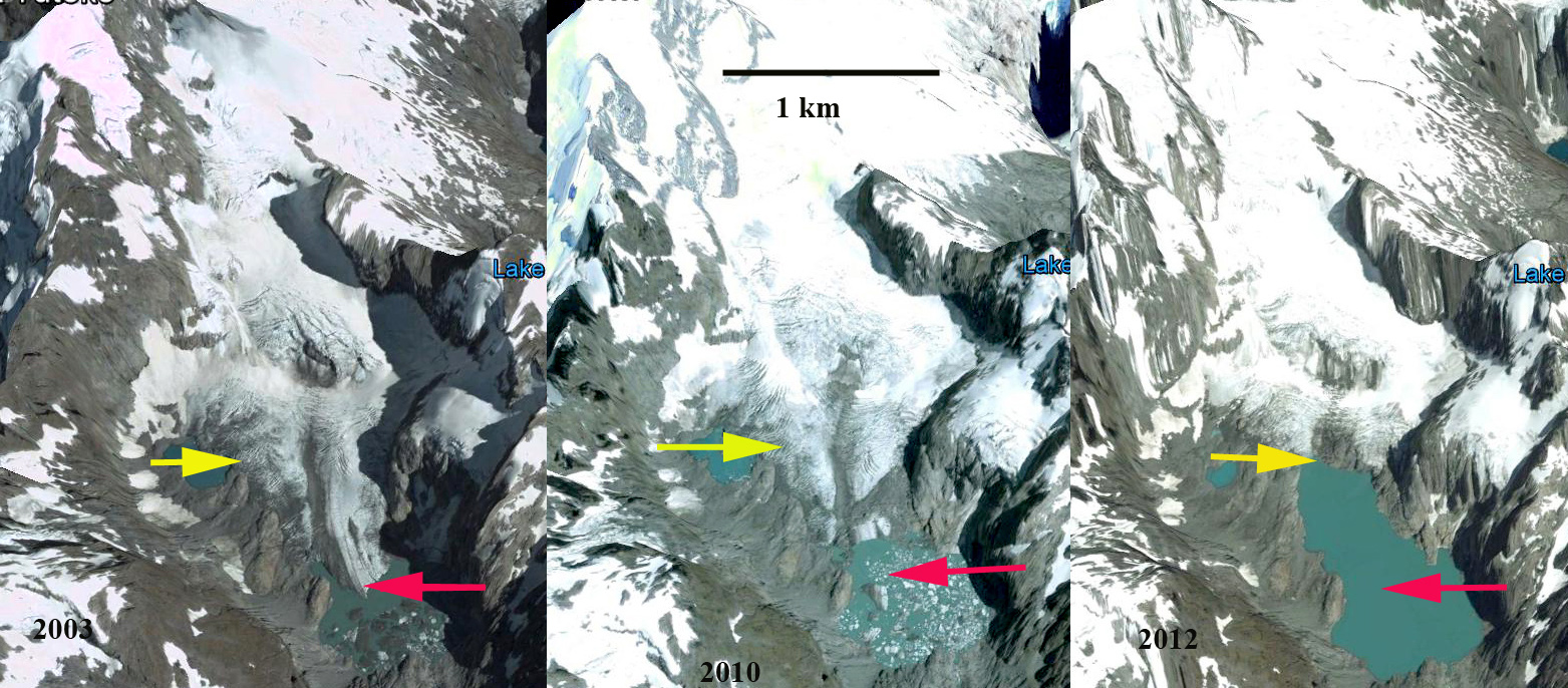 Donne Glacier from 2003-2012 in Google Earth images. Red arrow is the 2003 terminus and yellow arrow the 2012 terminus. A seven hundred meter retreat in a decade.