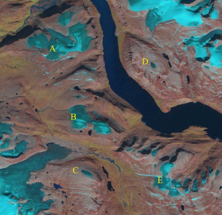 Comparison of 1995 and 2014 Landsat images of ice caps A, B, C, D and E.  Pink arrows indicate where A, B and E separated. C and D have disappeared.  F is an outlet glacier with a retreating terminus.