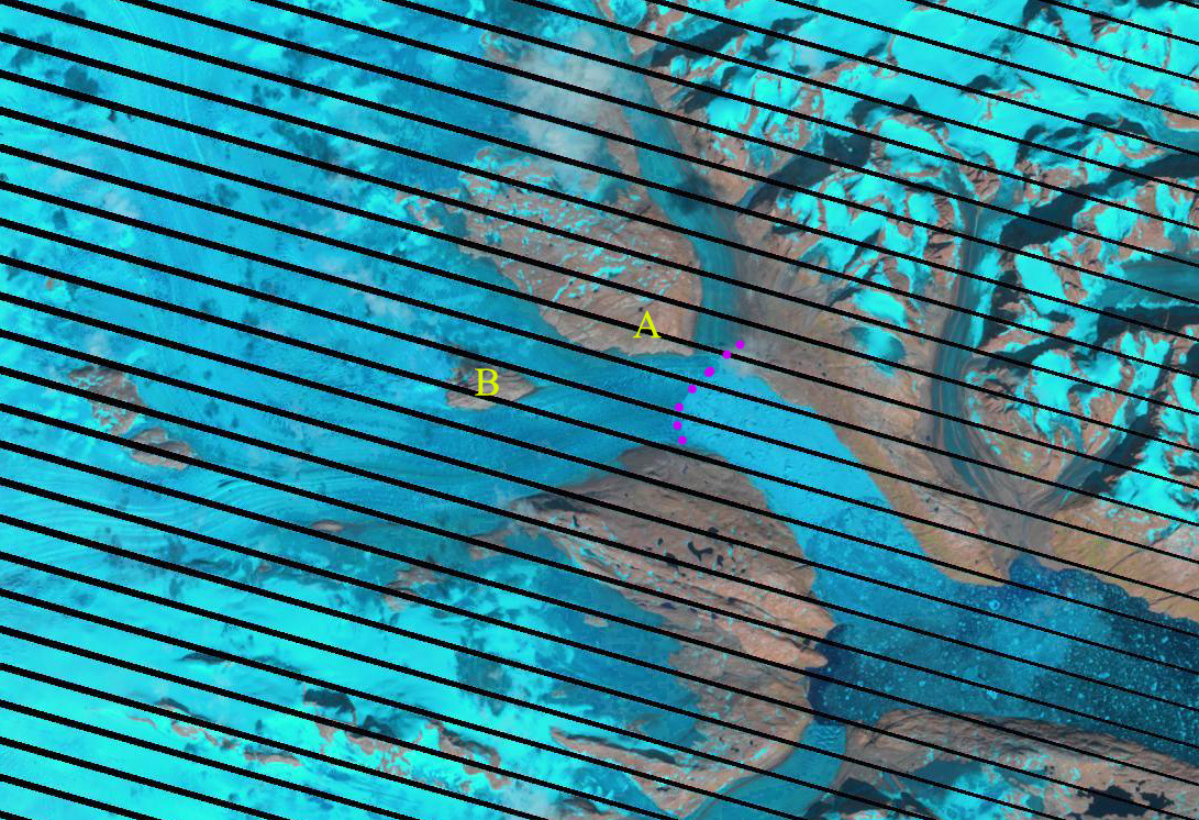Tingmiarmit Glacier comparison in 1999 and 2015 Landsat images indicating the separation of tributaries at the terminus. The red arrows indicate the 1999 terminus and the yellow arrows the 2015 terminus location. Point A is peninsula where the tributaries joined, and Point B is a nunatak just upglacier from the 2015 terminus.