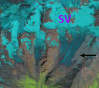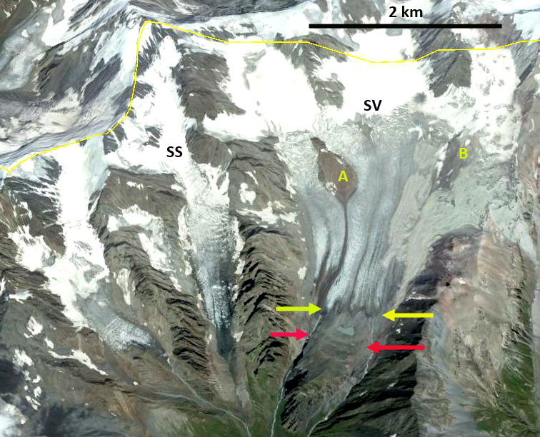 Comparison of Suatisi Vost (SV) and Suatisi Sredny (SS) in 1986 and 2015 Landsat images. The red arrow is the 1986 terminus and the yellow arrows the 2015 terminus. Point A and B are to areas of expanding bedrock amidst the glacier.